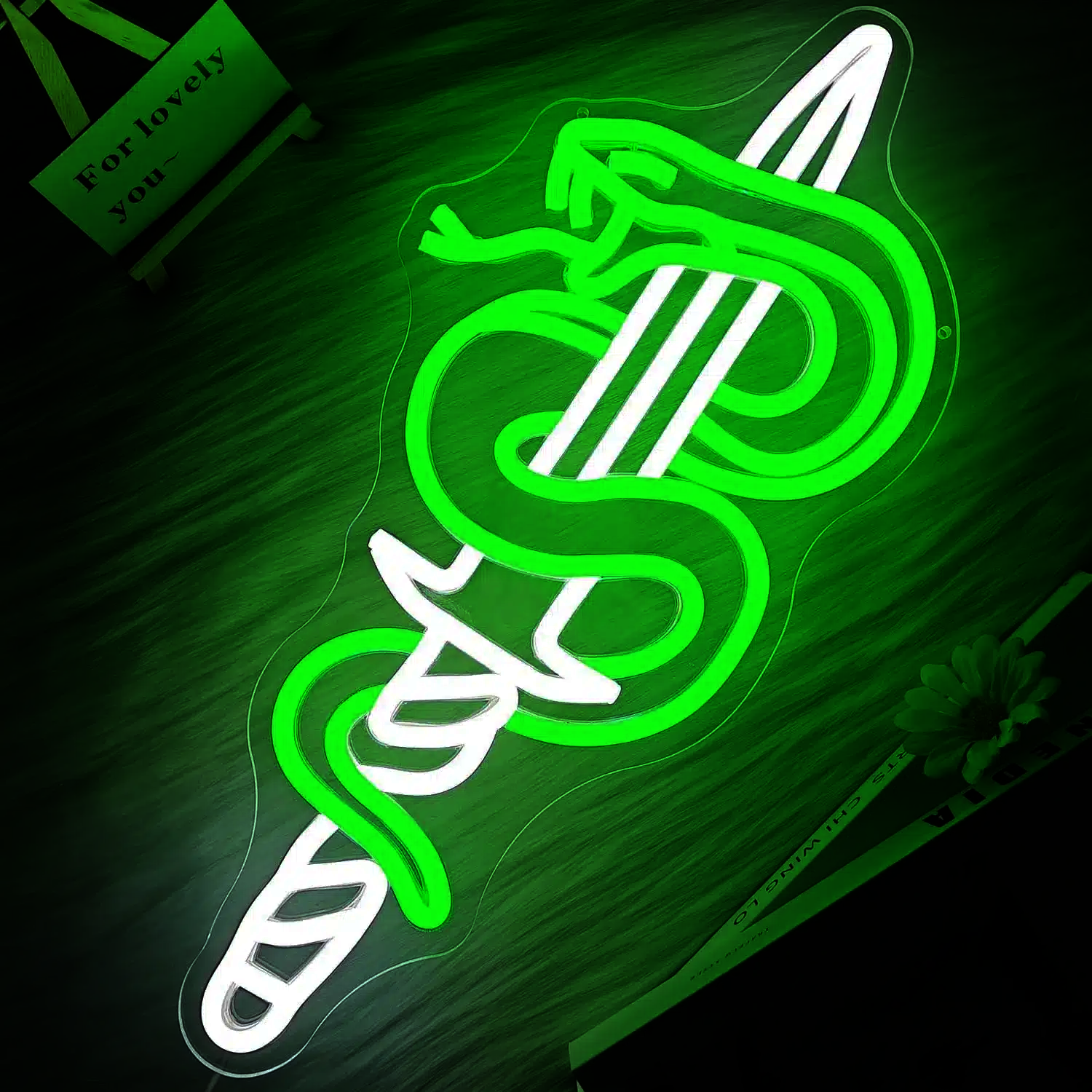 La couleur verte intense du serpent en néon lui confère une présence visuelle remarquable, contrastant élégamment avec la lumière blanche de l’épée.