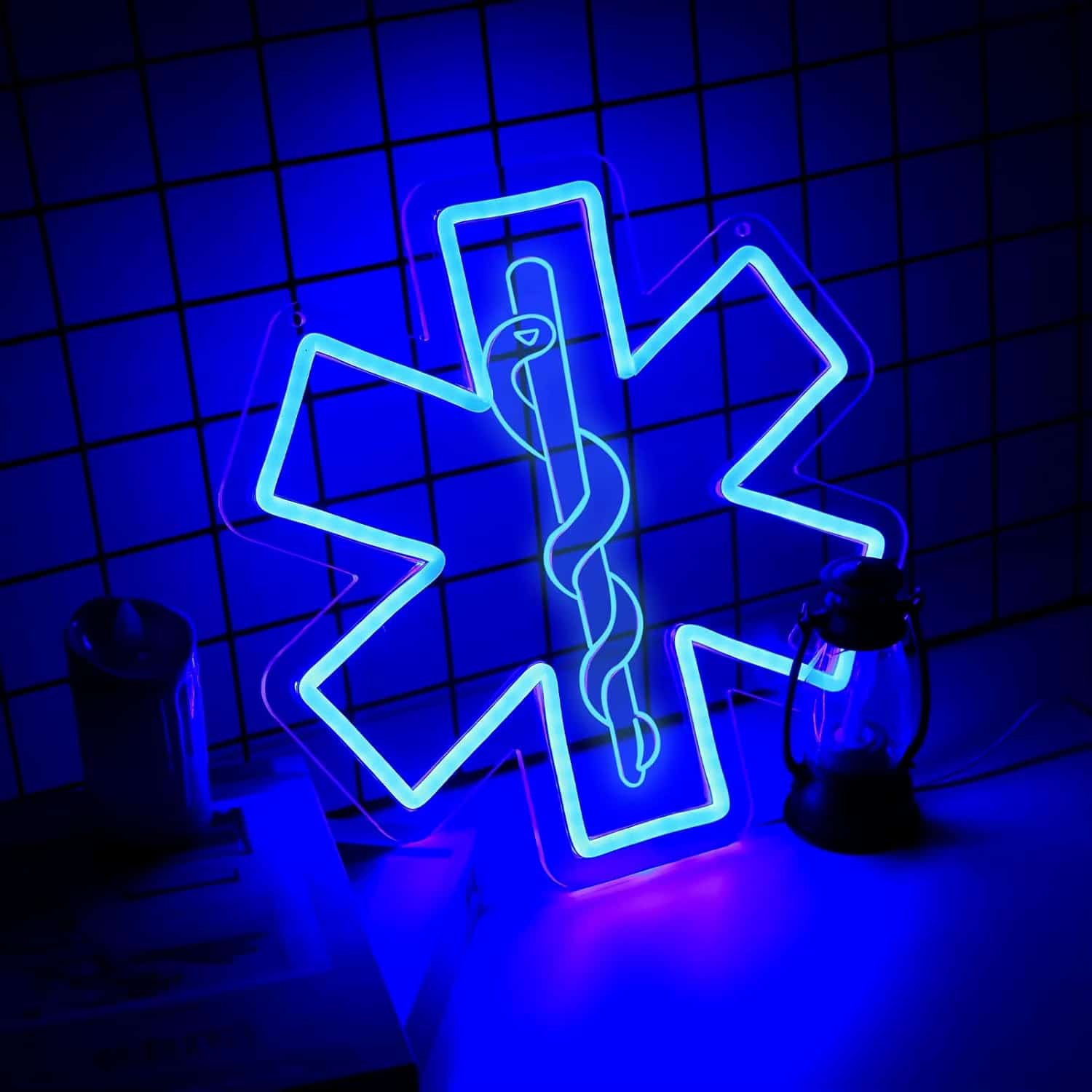 Le Néon Étoile de vie reproduit le symbole médical universellement reconnu : une étoile à six branches bleue avec le caducée d’Asclépios en son centre.