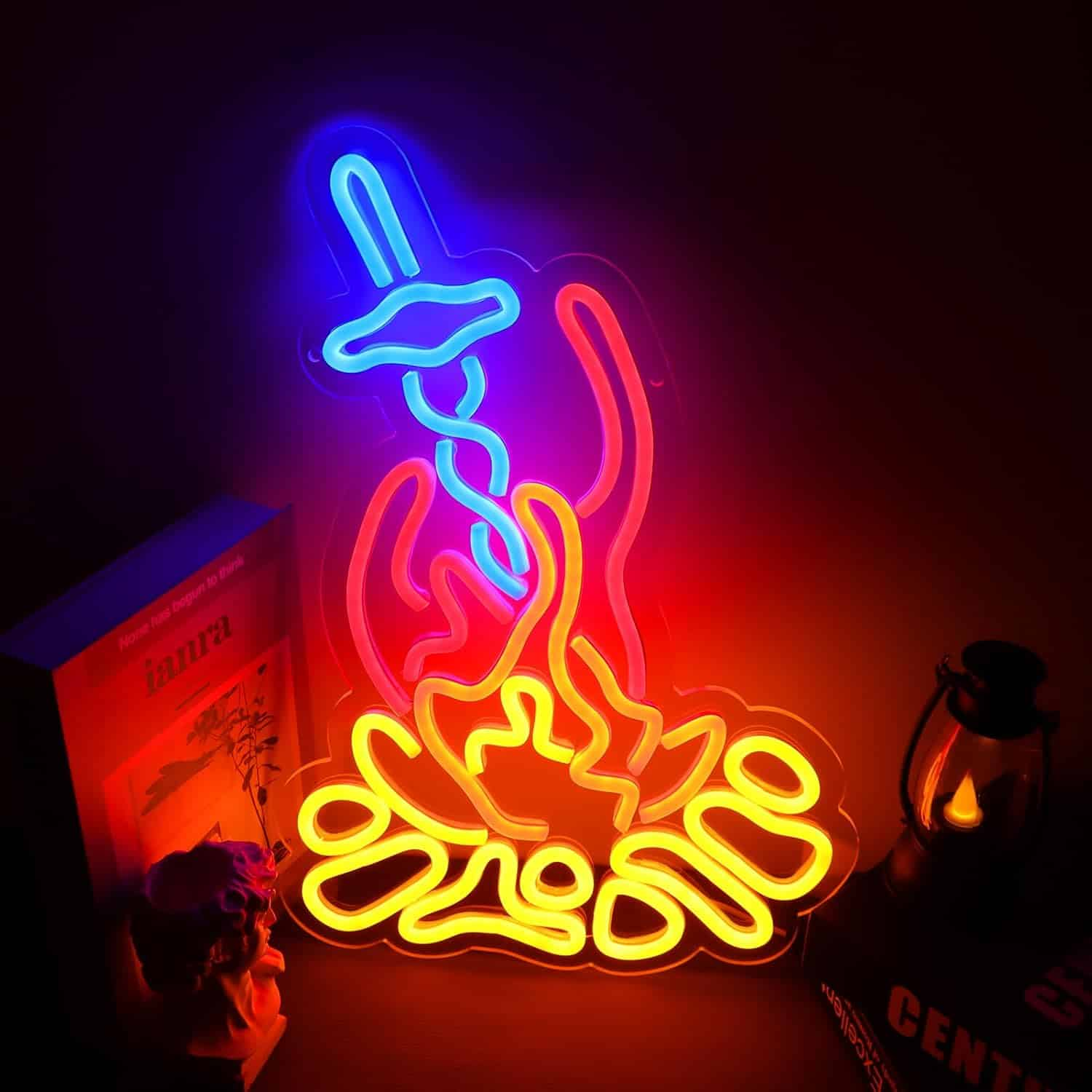Le Néon Feu de camp (Dark Souls) représente l’emblématique feu de joie de la célèbre série de jeux vidéo Dark Souls, avec une épée plantée au centre des flammes.