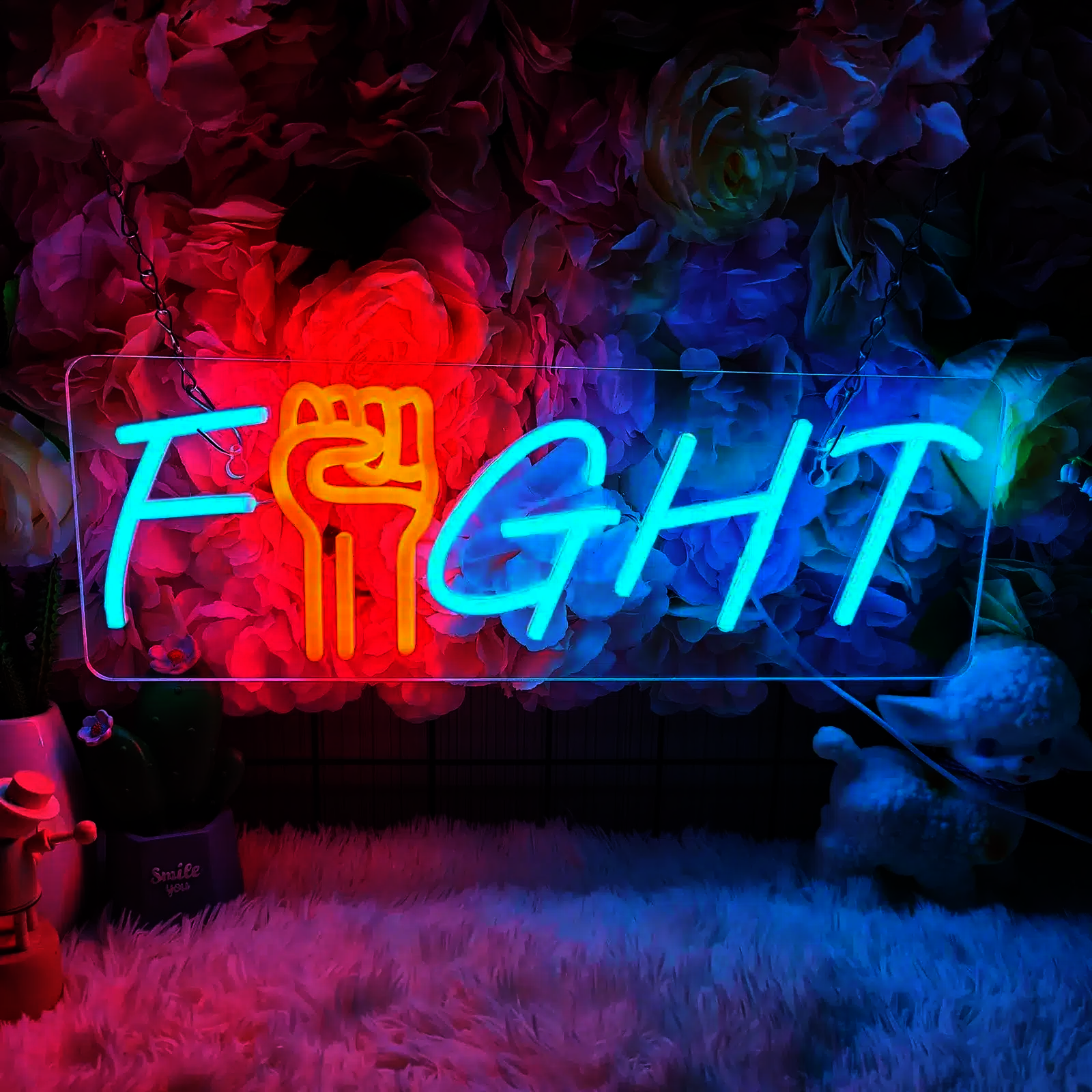 Le Néon Fight représente le mot “FIGHT” en lettres majuscules lumineuses, avec un poing levé remplaçant la lettre “I”.