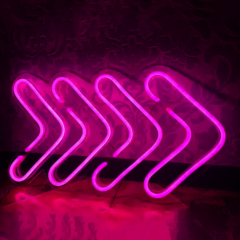 Illuminez votre espace avec le Néon Flèches, un design épuré et dynamique. Quatre flèches roses vif pointent vers la droite sur un fond violet, créant un effet de mouvement captivant et une ambiance électrique moderne.