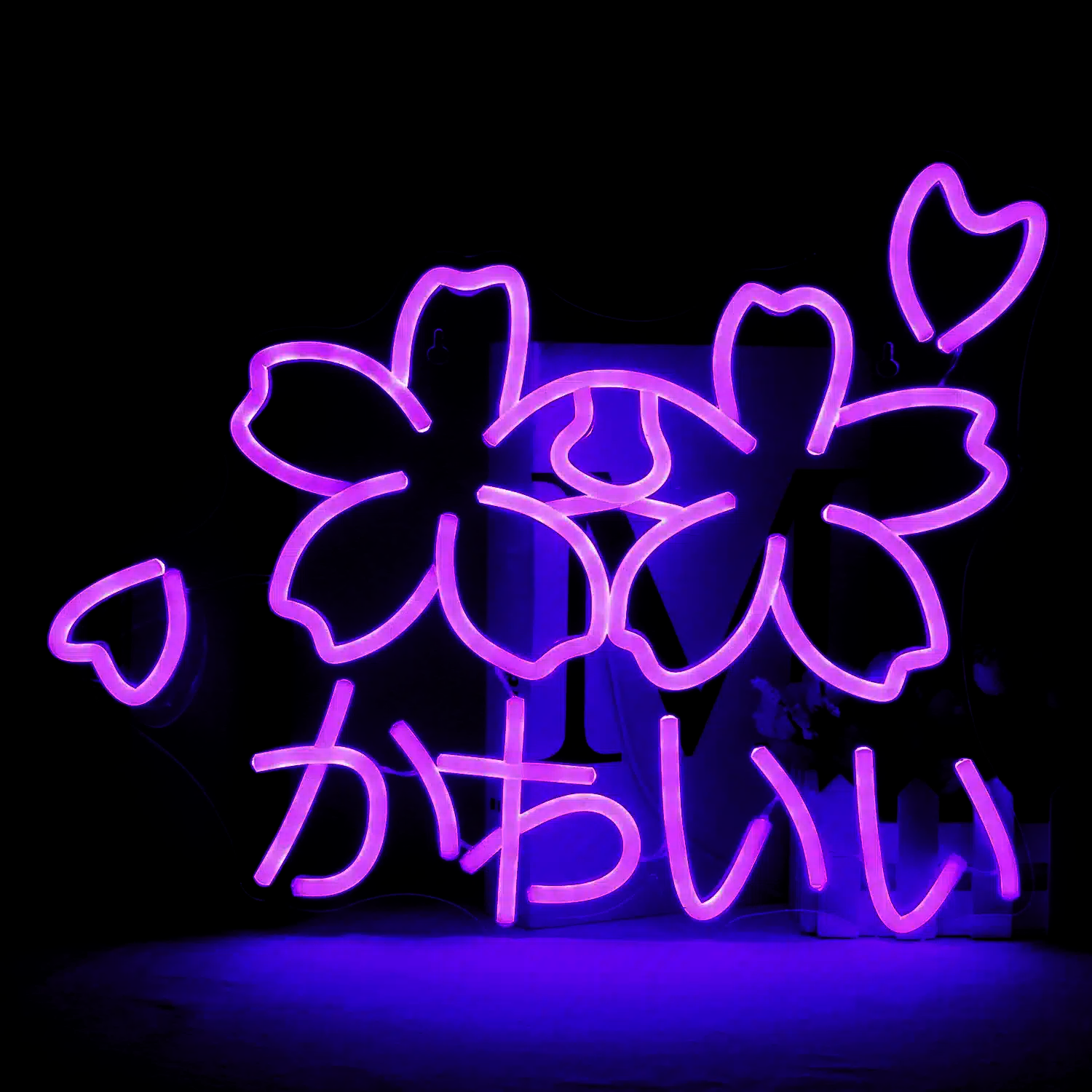 Plongez dans l’univers kawaii avec ce néon fleur de cerisier. Deux sakuras stylisées et le mot “かわいい” en hiragana japonais s’illuminent en rose néon, fusionnant tradition et pop culture nippone.