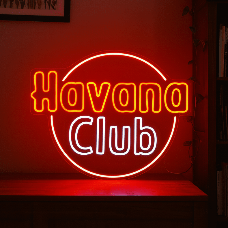 Ce néon affiche “Havana Club” dans une typographie élégante et arrondie, encerclée par un fin contour lumineux qui délimite parfaitement l’ensemble du design.
