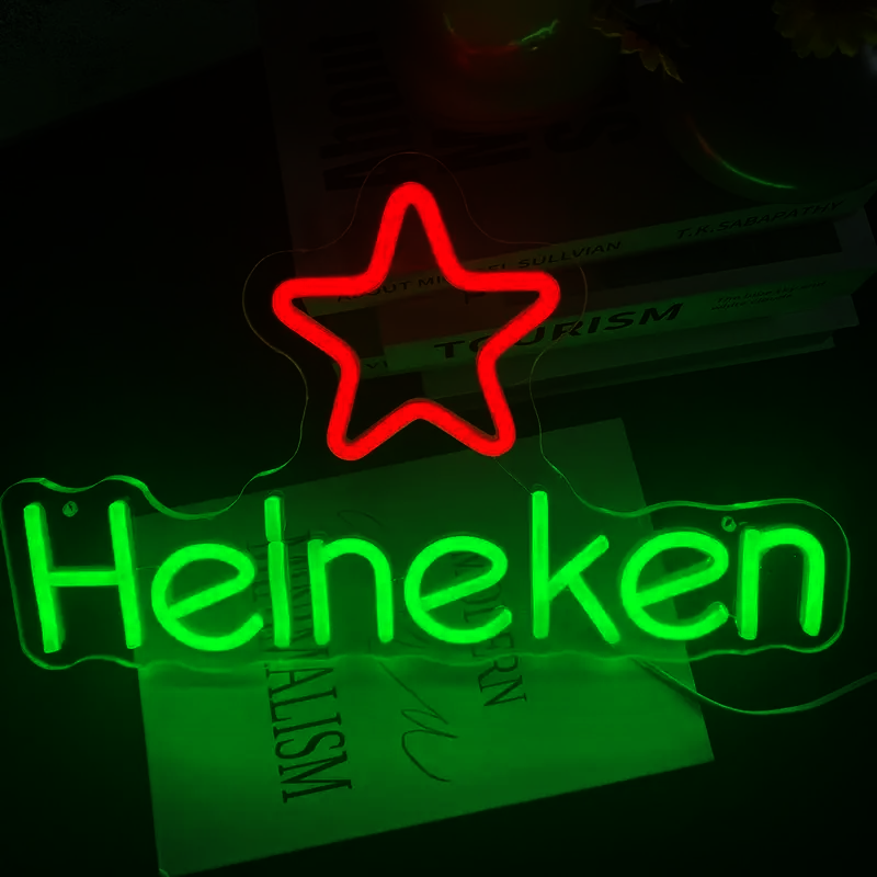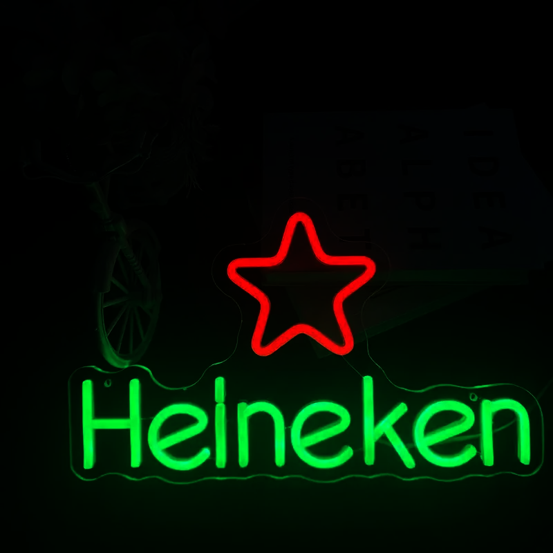 Le Néon Heineken reprend fidèlement le nom de la marque Heineken, avec “Heineken” écrit en vert sous l’emblématique étoile rouge.