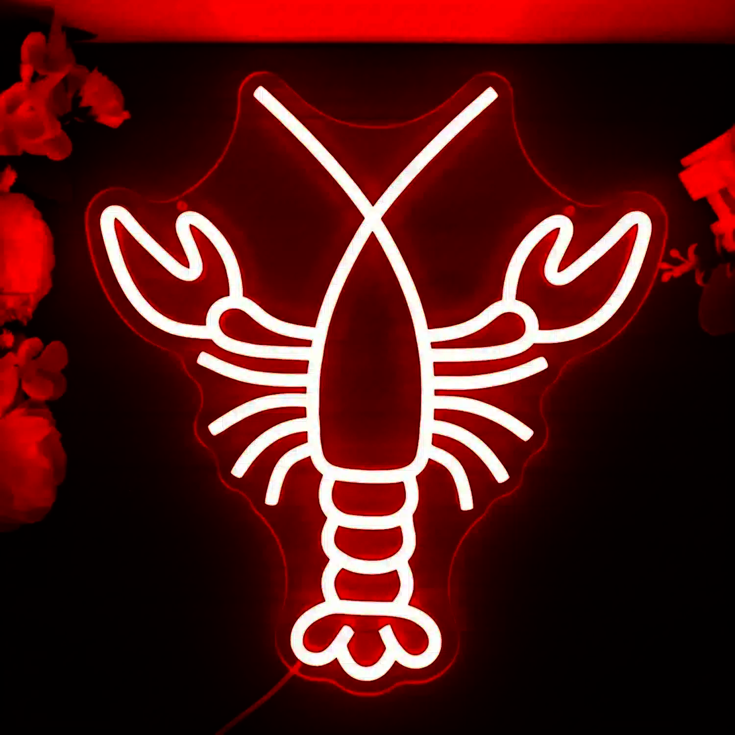 Le Néon Homard représente un néon en forme de crustacé, un homard avec ses pinces caractéristiques, son corps segmenté et ses antennes distinctives.