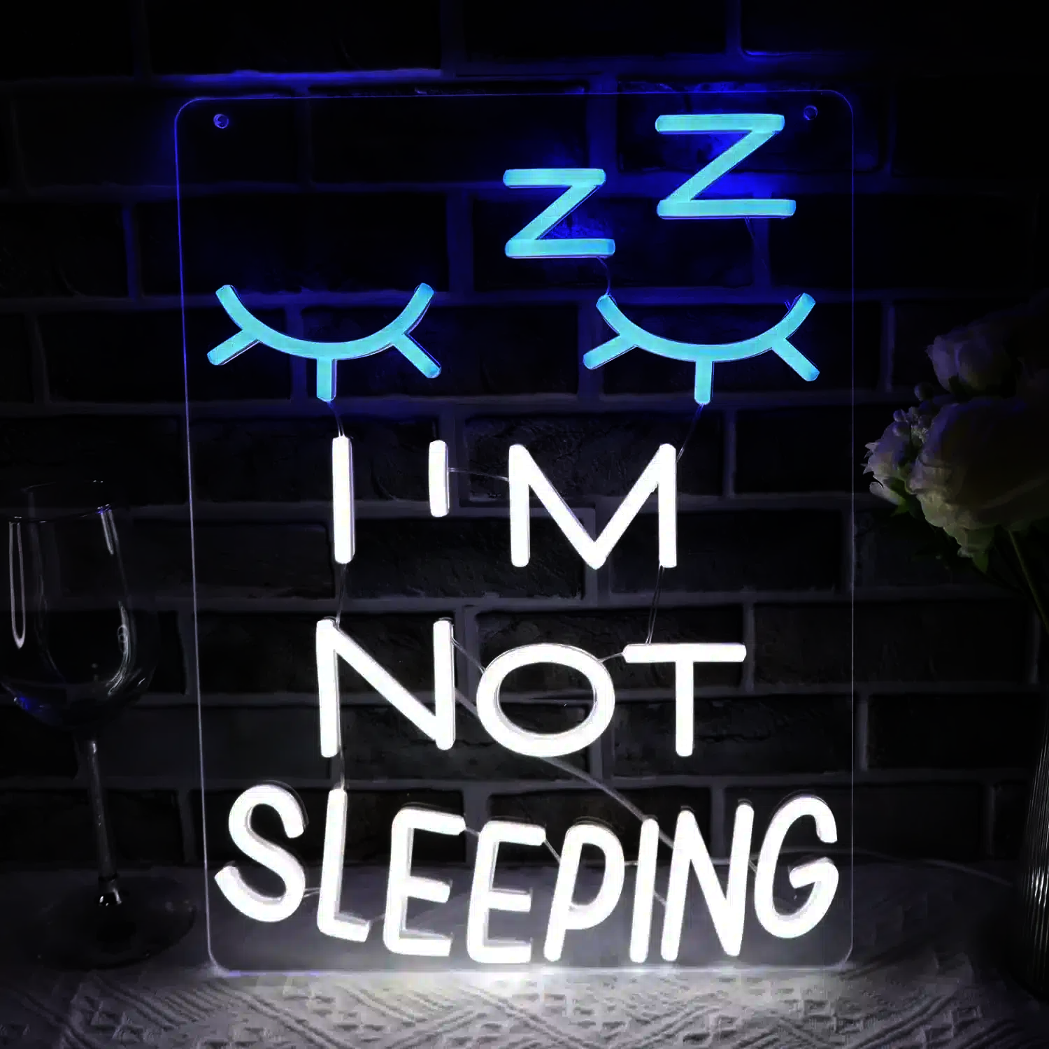 Ce néon représente deux visages stylisés avec des yeux fermés et des “Zzz” flottant au-dessus, symbolisant le sommeil, suivis du texte “I’M NOT SLEEPING” (Je ne dors pas) en dessous.