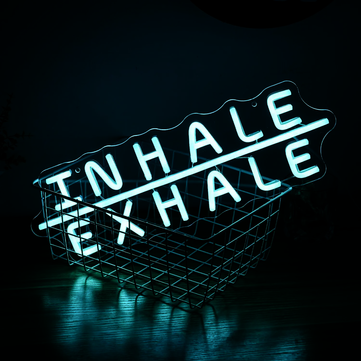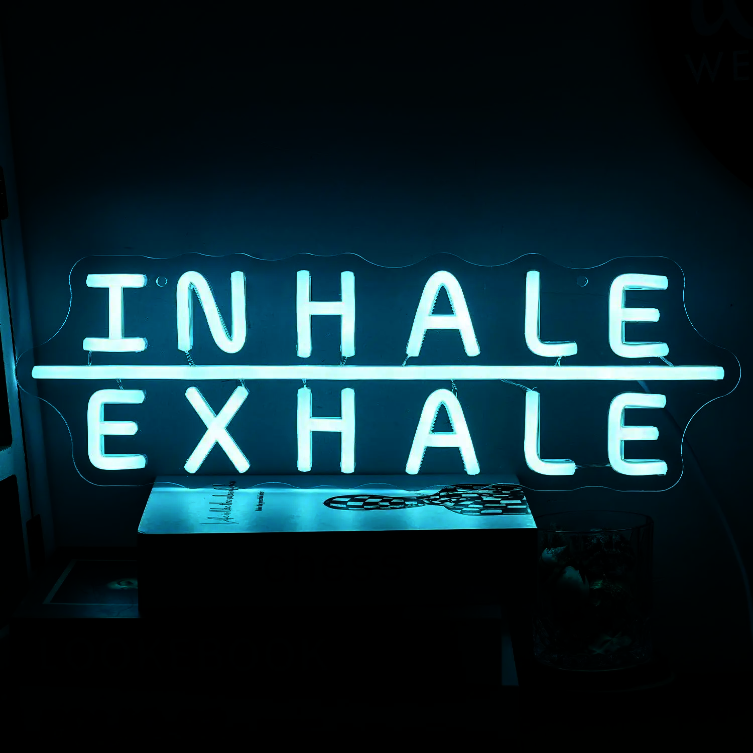 Dimensionné à 40 cm de largeur et 20 cm de hauteur, ce néon est parfait pour créer un point focal sans envahir l’espace. “INHALE” et “EXHALE” traduisent respectivement “INSPIRER” et “EXPIRER”, renforçant son rôle de rappel à pratiquer la respiration consciente.