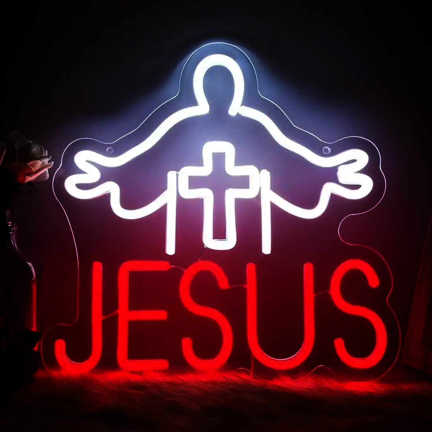 Le Néon Jesus représente une silhouette stylisée du Christ avec les bras ouverts et un symbole de croix au centre, surmontée du mot “JESUS” en lettres majuscules.
