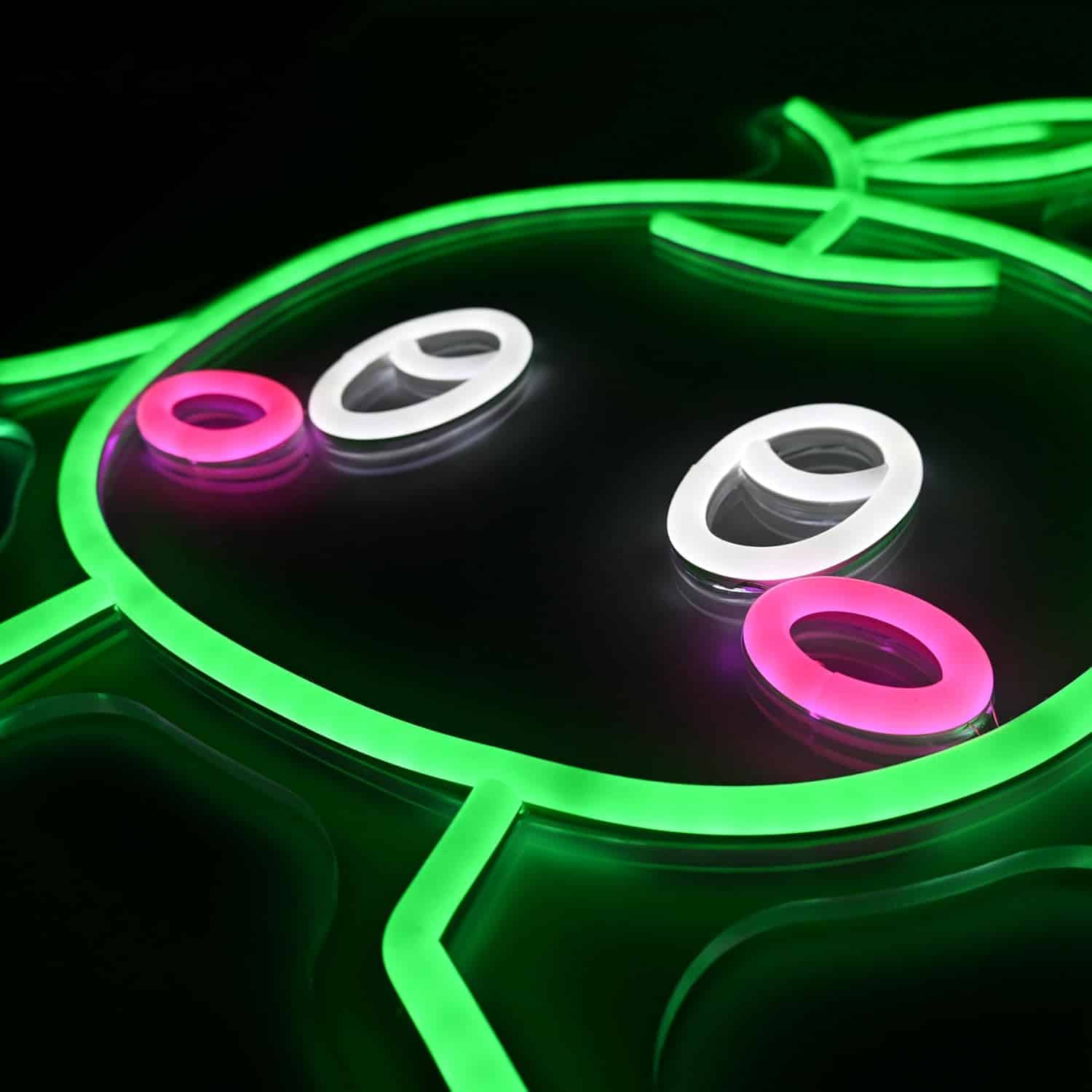 Ce néon présente un Junimo vert pomme au design minimaliste et attachant, avec sa forme arrondie caractéristique surmontée d’une petite feuille.