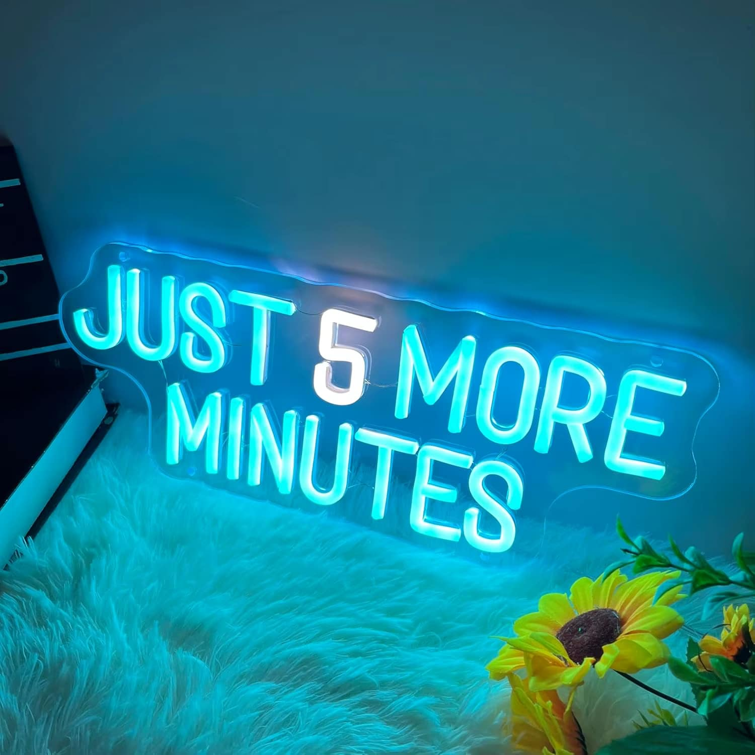 Le Néon Just 5 more minutes affiche le message “JUST 5 MORE MINUTES” en lettres lumineuses bleues et blanches.