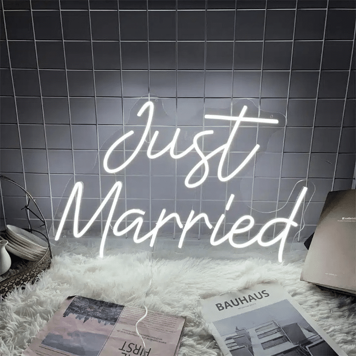 Le Néon Just Married affiche en lettres lumineuses l’expression anglaise signifiant “Jeunes Mariés” en français.