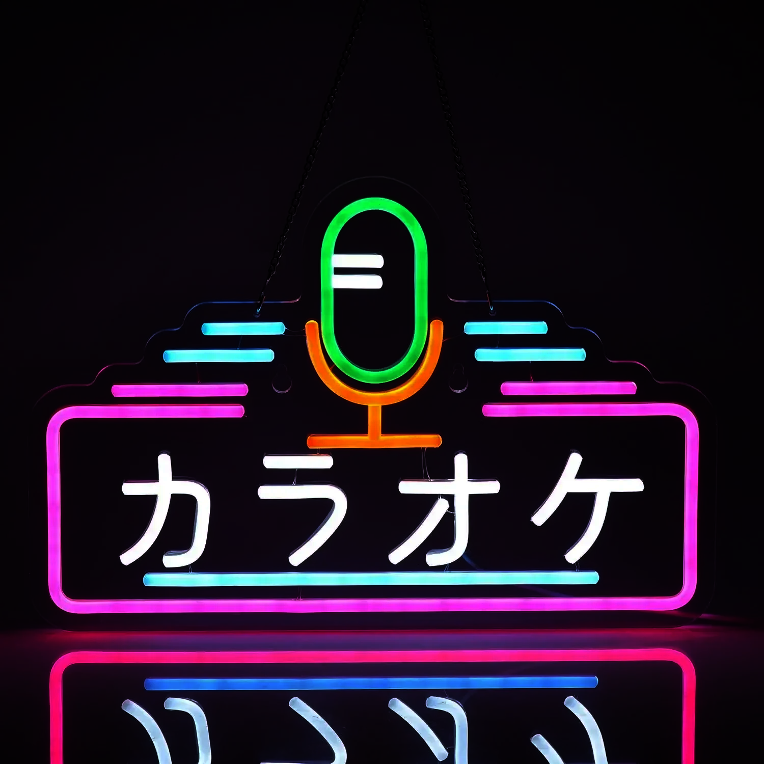 Les caractères japonais sous le microphone forment le mot “カラオケ” (karaoke), ajoutant une touche d’authenticité et d’exotisme au néon.