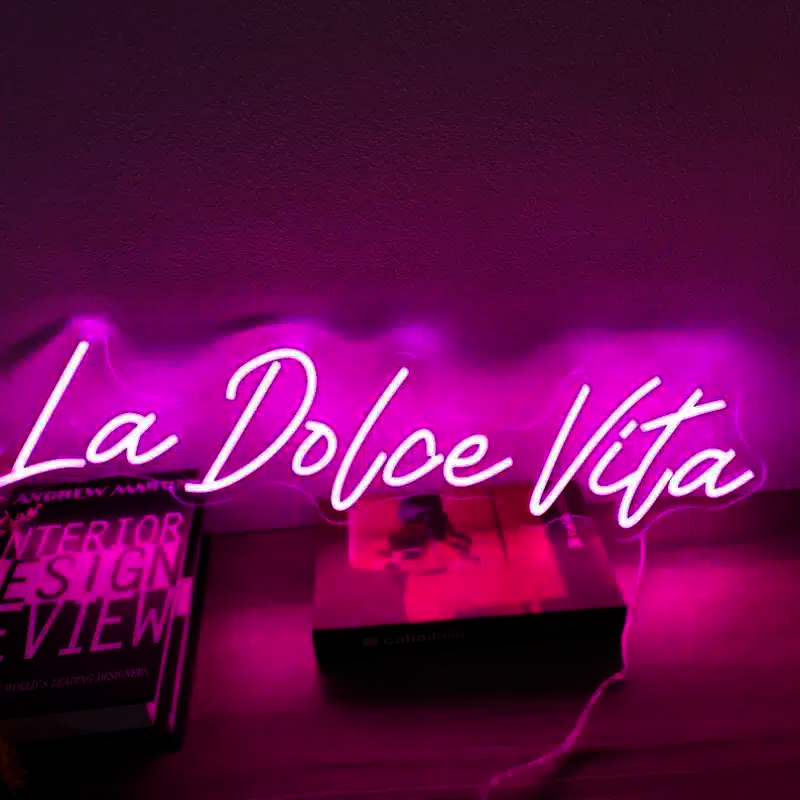 Le Néon La Dolce Vita affiche cette célèbre expression italienne en lettres cursives lumineuses d’un rose vif éclatant.