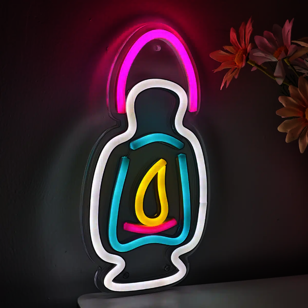 Le Néon Lampe à Huile représente une lampe à huile aux contours blancs avec une flamme jaune au centre et une poignée rose qui l’entoure.