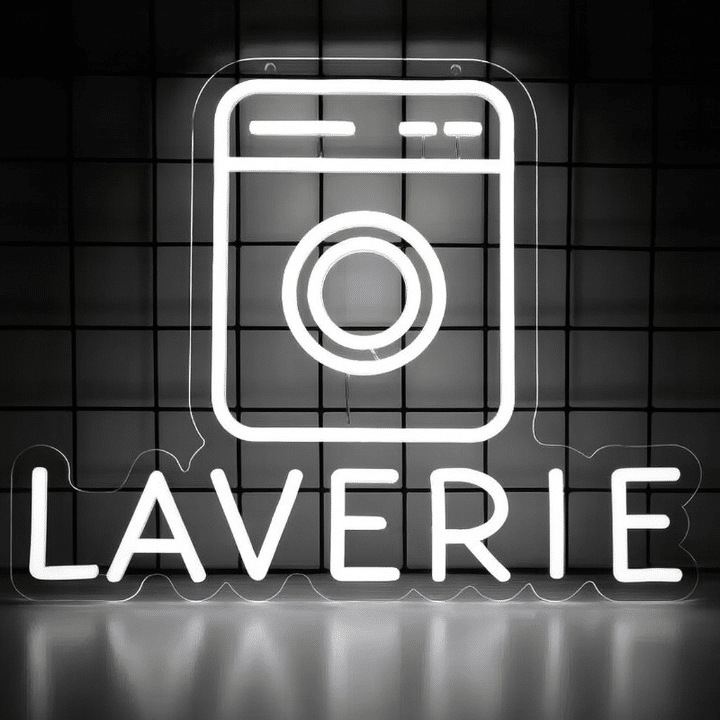 Le Néon Laverie représente une machine à laver stylisée dans un design épuré et moderne.