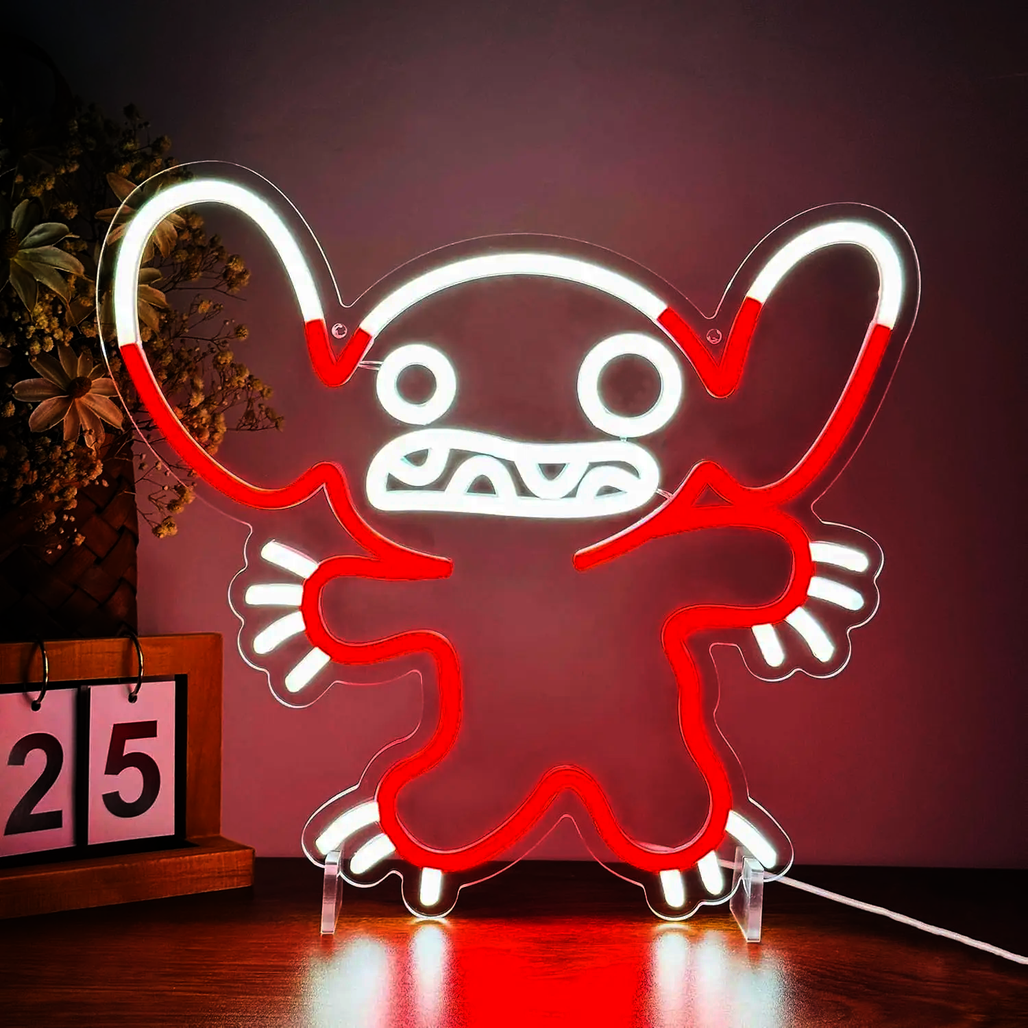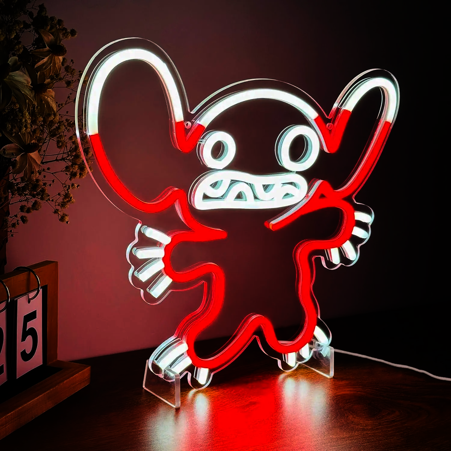 Le Néon Leroy (Stitch Rouge) représente le célèbre personnage de Disney dans une version rouge éclatante, avec ses grandes oreilles rondes, ses yeux expressifs et ses bras étendus dans une pose accueillante.