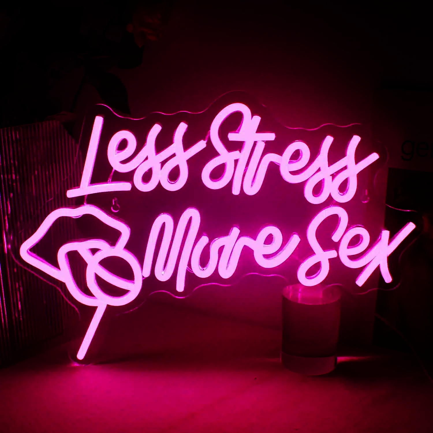 Le Néon Less Stress More Sex affiche un message provocateur : ce néon présente le texte “Less Stress More Sex” (Moins de stress, plus de sexe) dans une écriture fluide et élégante.