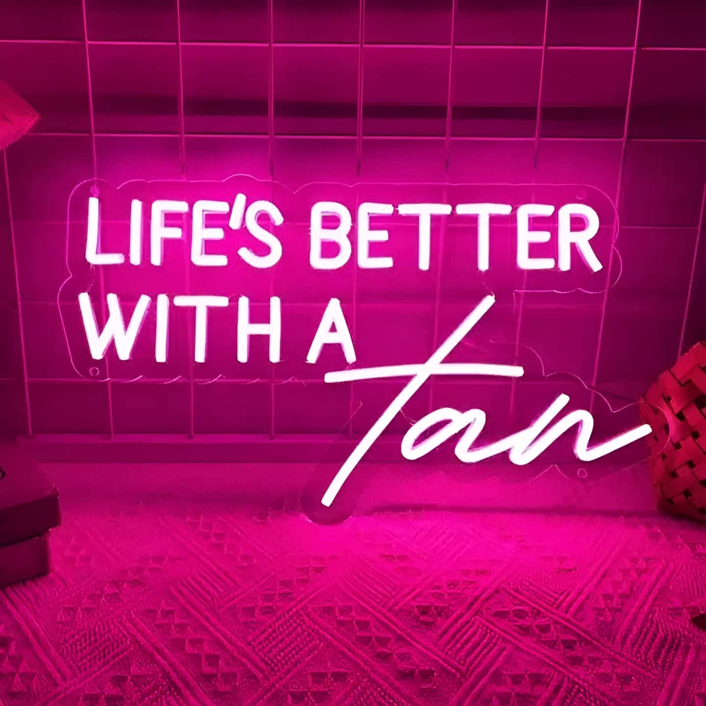 Le Néon Life’s Better With a Tan affiche le message “La vie est plus belle avec un bronzage” dans une typographie moderne et élégante.