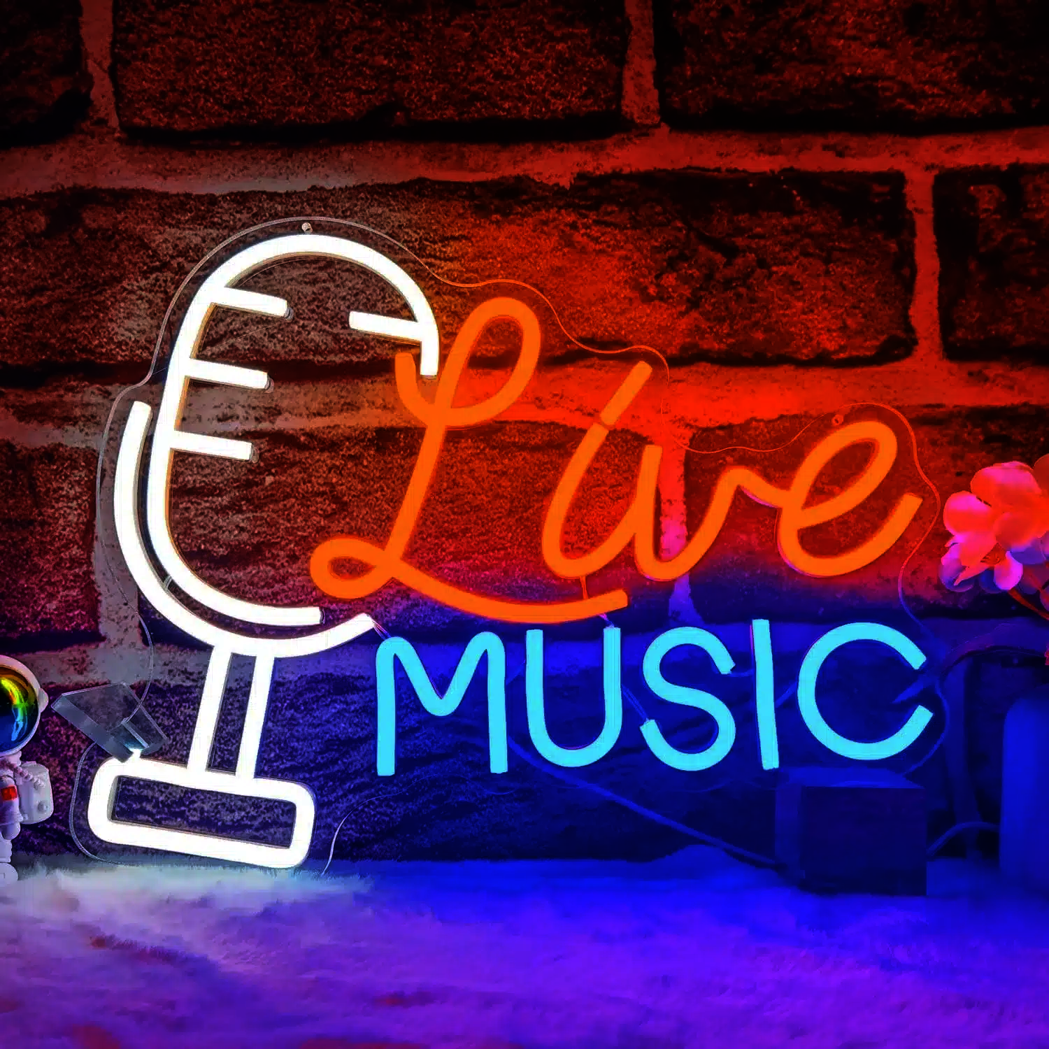 Ce néon affiche le mot “Live” en orange vif, suivi de “MUSIC” en bleu éclatant. La traduction en français serait “Musique en direct”.
