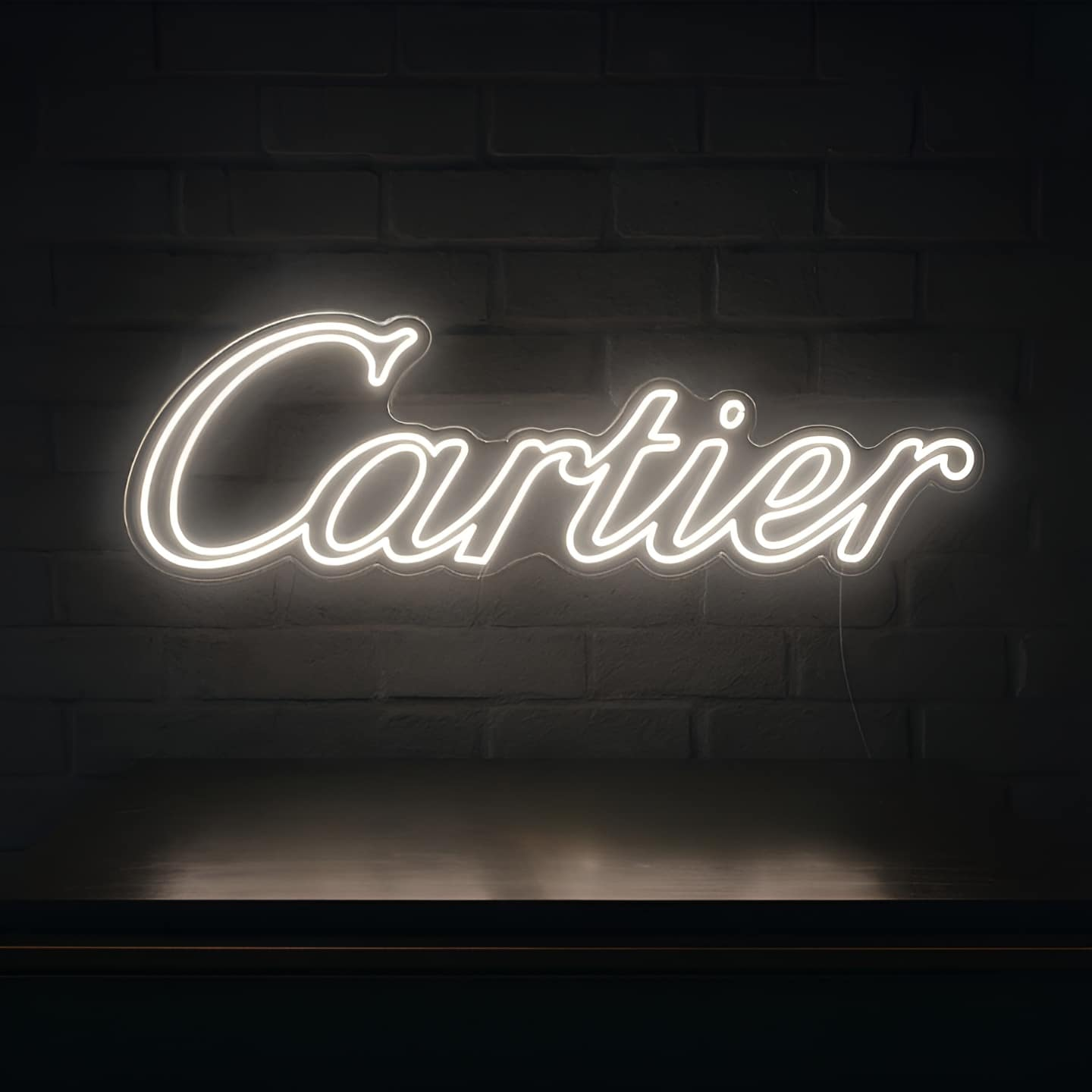 Ce néon affiche le nom “Cartier” dans une typographie cursive raffinée, avec des lettres blanches chaudes qui reproduisent l’identité visuelle emblématique de la marque.