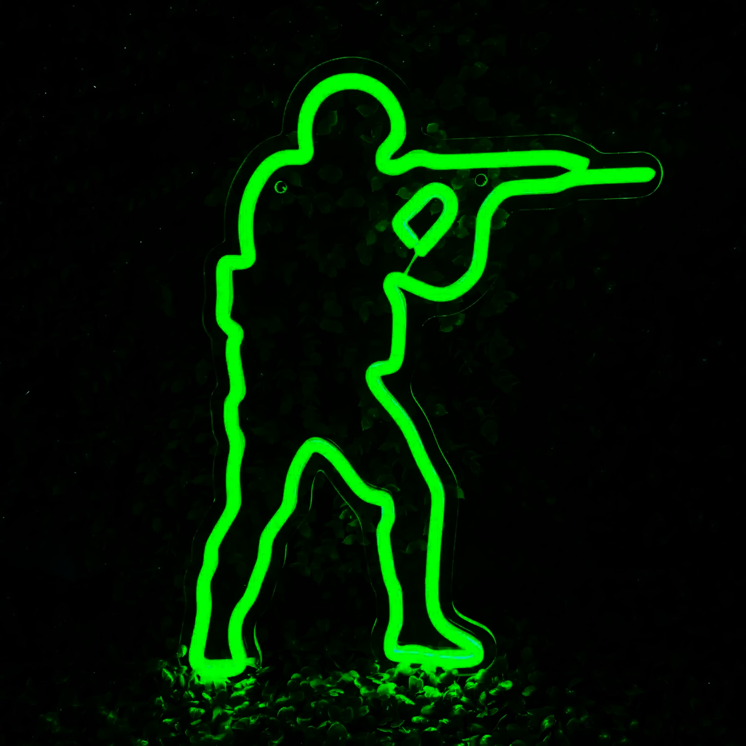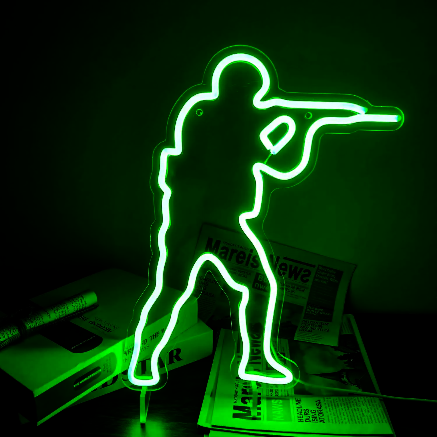 Le Néon Logo Counter Strike représente un personnage en position de tir, tenant une arme à feu pointée vers l’avant.