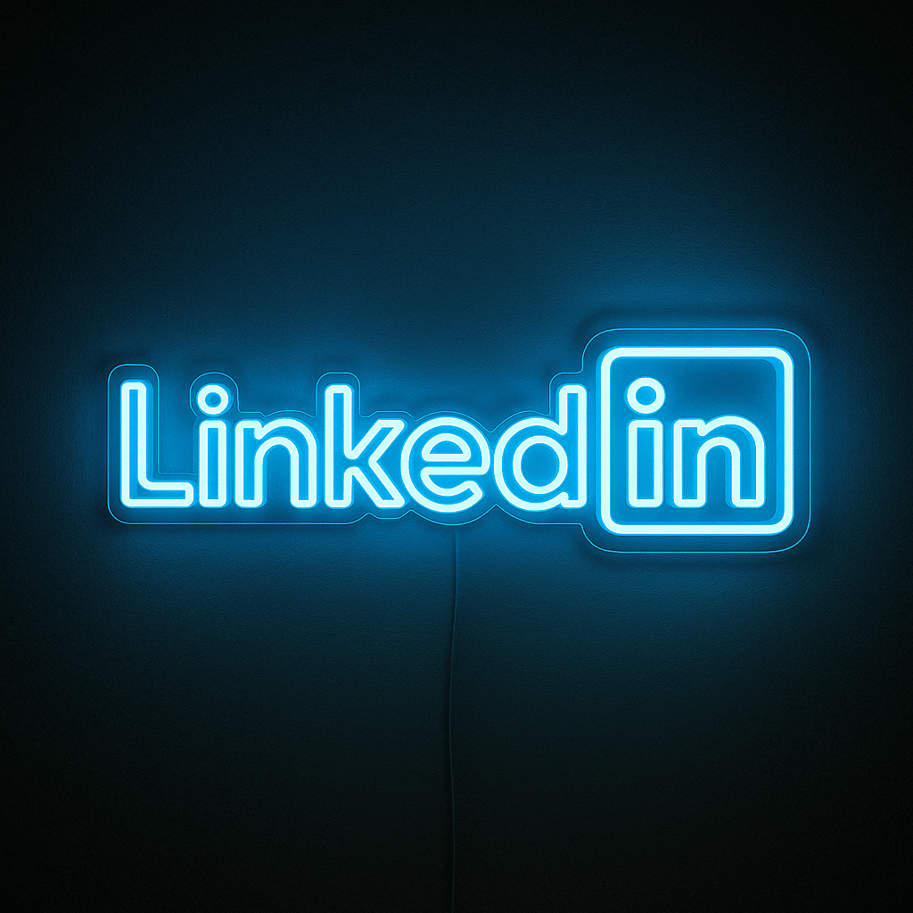 Le Néon Logo LinkedIn représente le logo de la plateforme professionnelle LinkedIn, illuminé d’une lumière bleue néon vive et éclatante.
