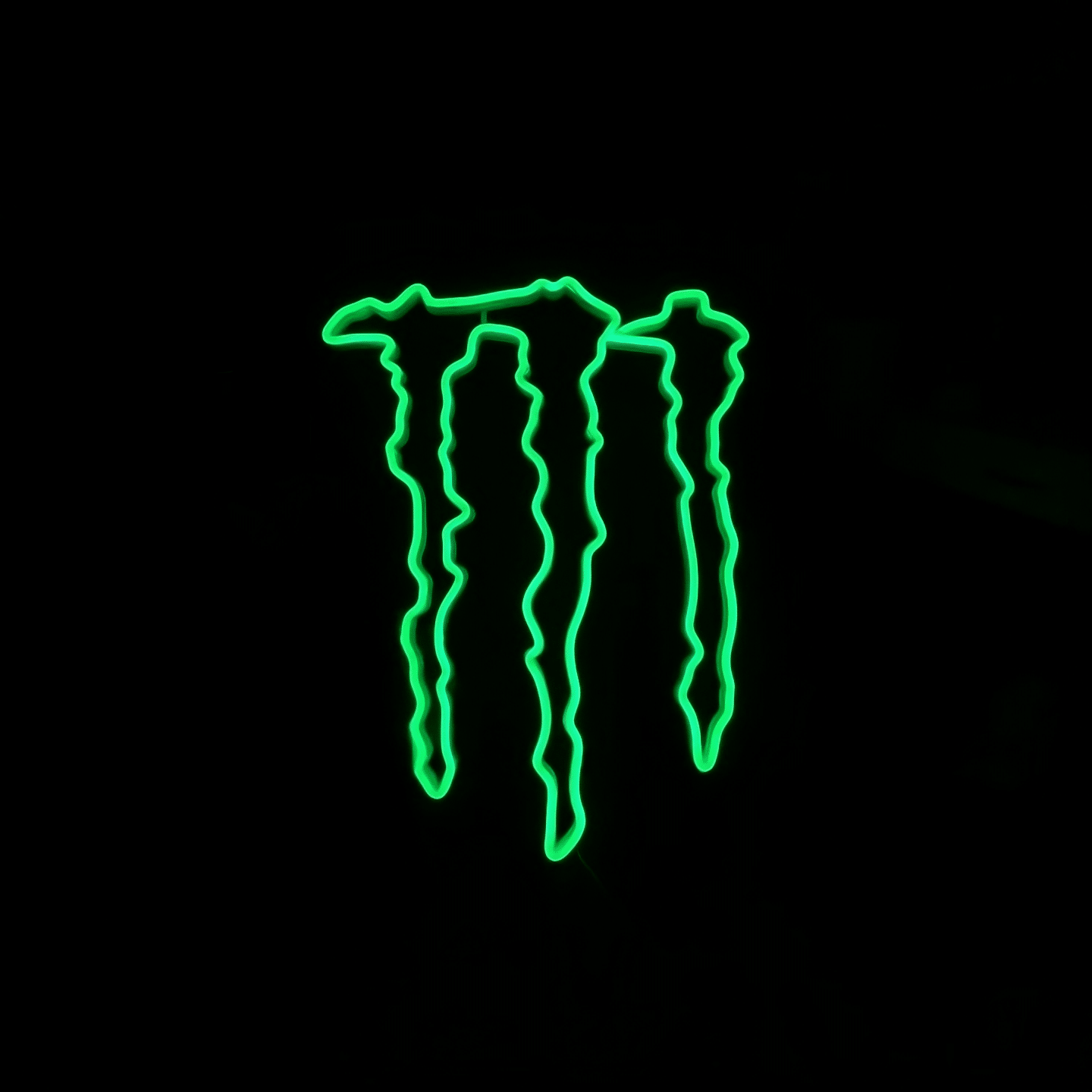 Les lignes du Néon Logo Monster sont dessinées avec un trait épais et irrégulier, donnant l’impression de griffures ou d’éclaboussures, en accord avec l’image dynamique et agressive de la marque.