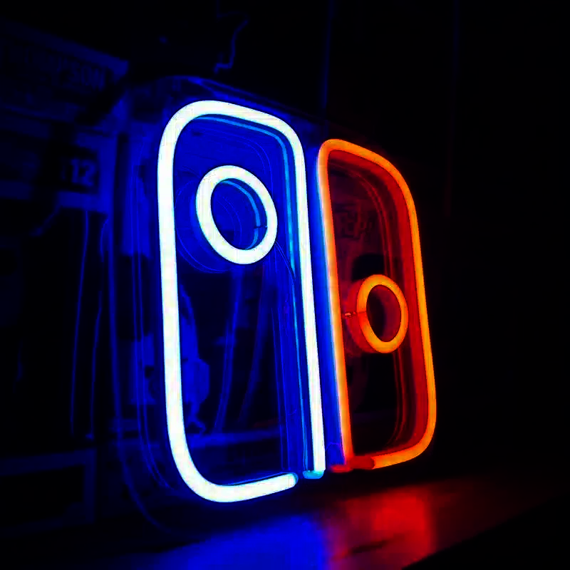 Le Néon Logo Switch reproduit fidèlement l’emblématique manette Joy-Con de la console de jeu Nintendo Switch, avec ses couleurs bleu et rouge caractéristiques.