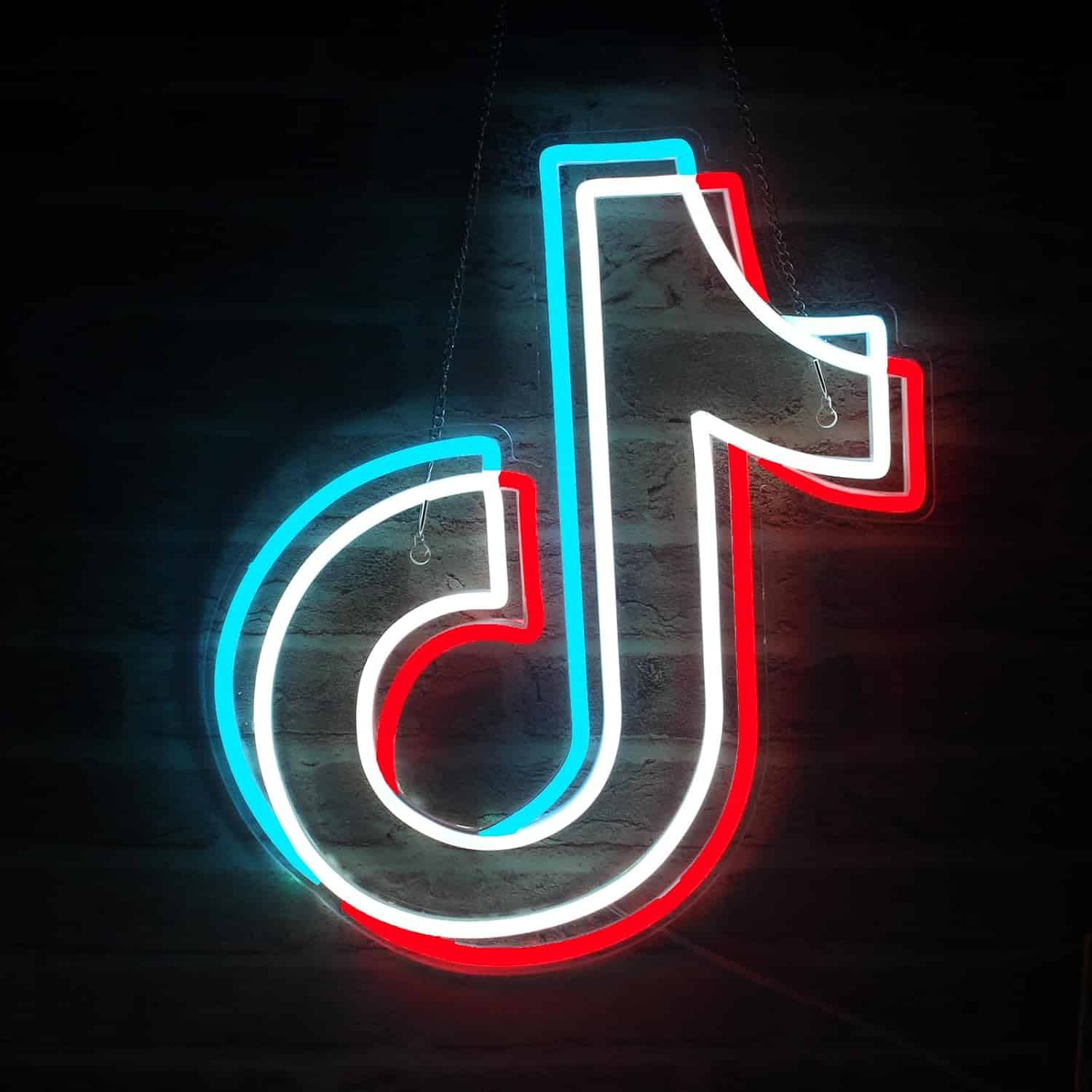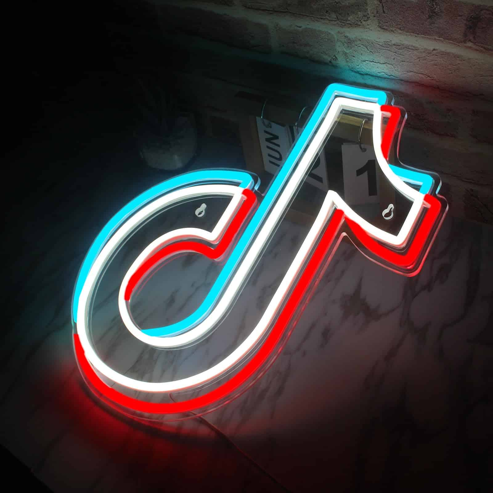 Le Néon Logo TikTok représente l’emblématique symbole de la plateforme de médias sociaux avec ses couleurs caractéristiques blanc, bleu cyan et rouge vif.