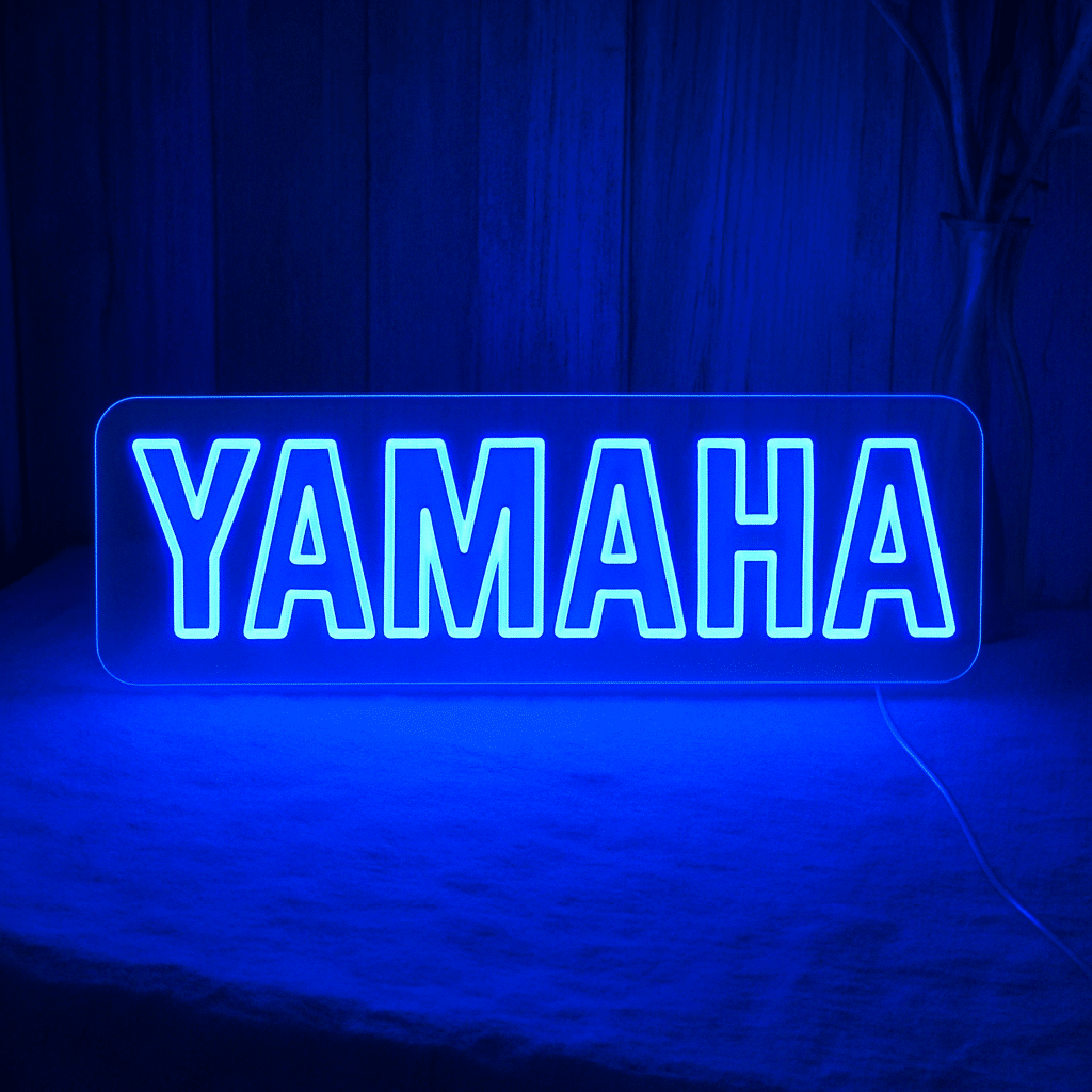 Ce néon affiche le mot “YAMAHA” en lettres majuscules stylisées, entouré d’un cadre rectangulaire aux coins légèrement arrondis, le tout dans une teinte bleue électrique vibrante.