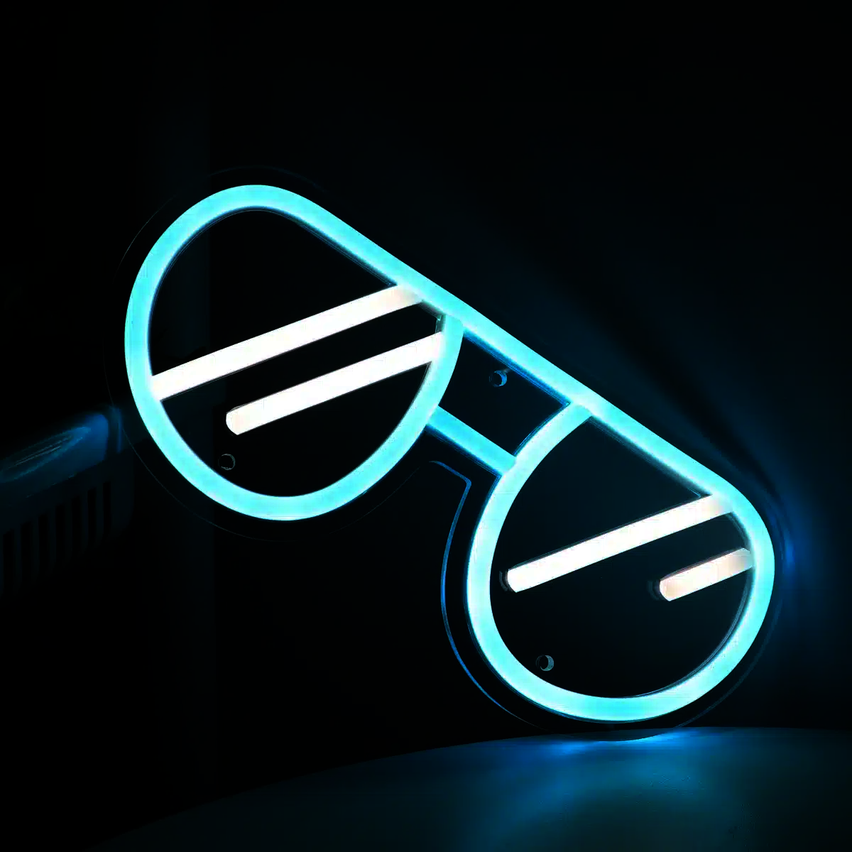 Le Néon Lunettes Aviateur représente une paire de lunettes de style aviateur dessinée en tubes lumineux bleu turquoise.