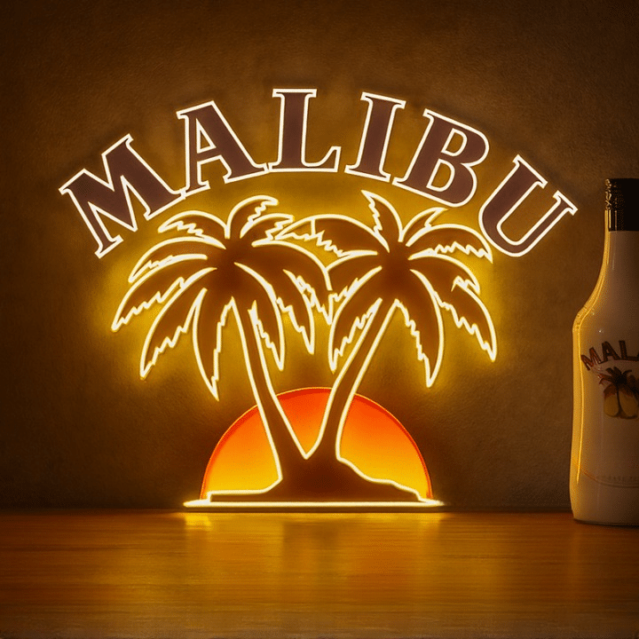 Le Néon Malibu reprend fidèlement le logo iconique de la célèbre marque de rhum Malibu, avec son inscription lumineuse en lettres capitales blanches surmontant un palmier tropical stylisé.