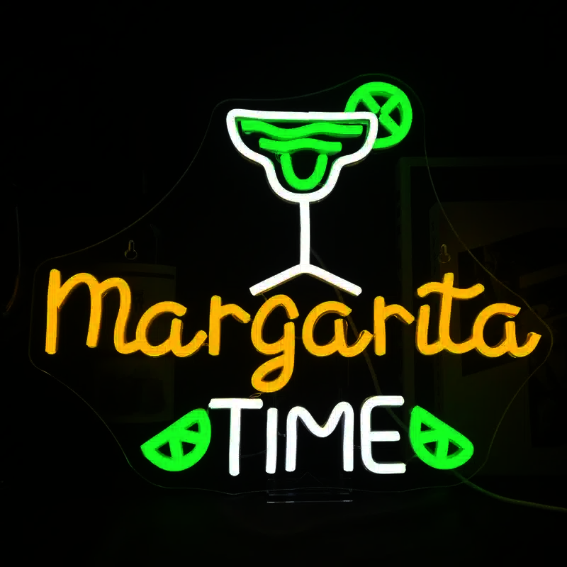 Le Néon Margarita Time représente l’univers festif des cocktails mexicains avec un verre à margarita stylisé surmonté de l’inscription “Margarita TIME” (traduit en “C’est l’heure de la Margarita !”) en lettres lumineuses.