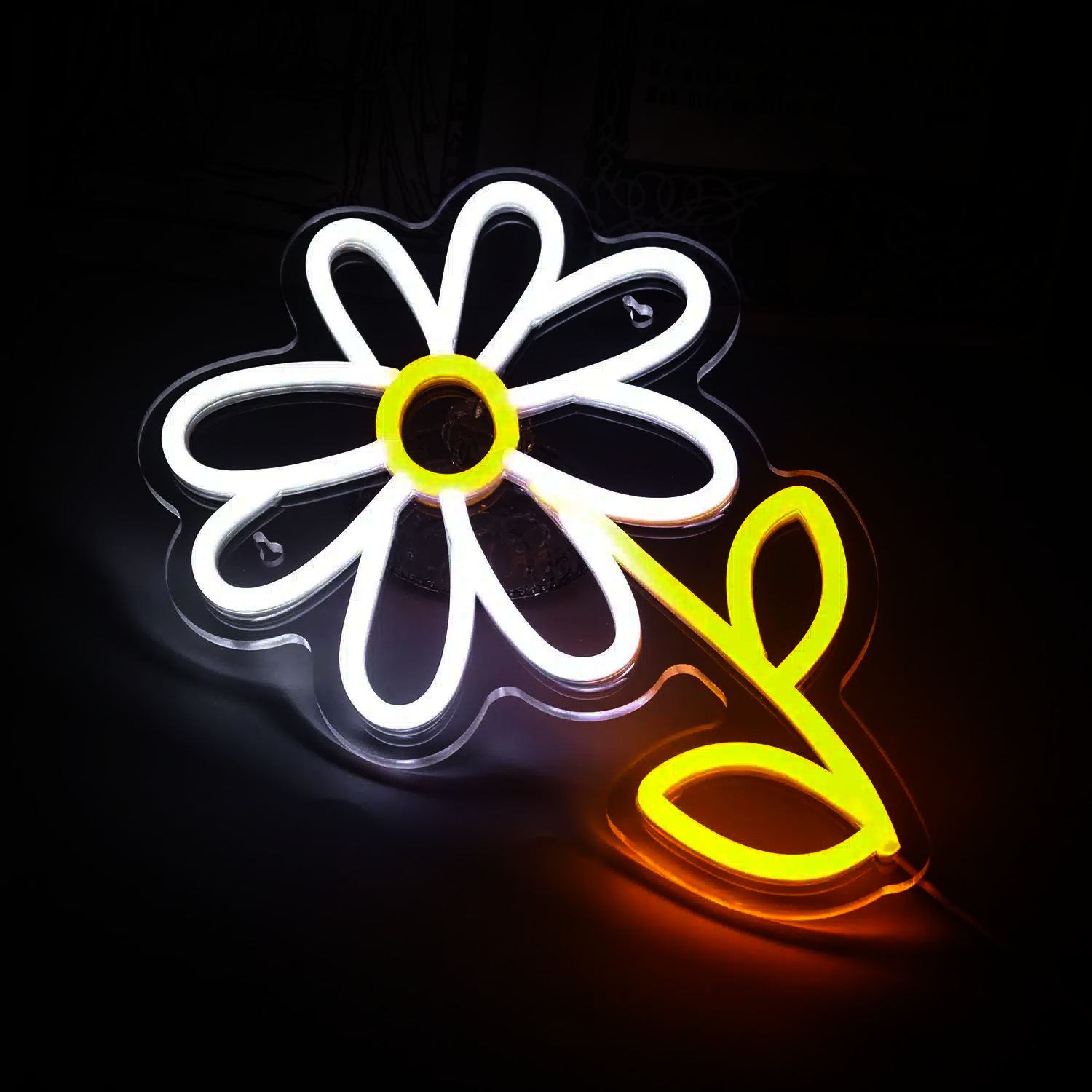 Le Néon Marguerite représente une délicate fleur printanière à la tige jaune, ornée de pétales blancs lumineux entourant un cœur jaune vif.