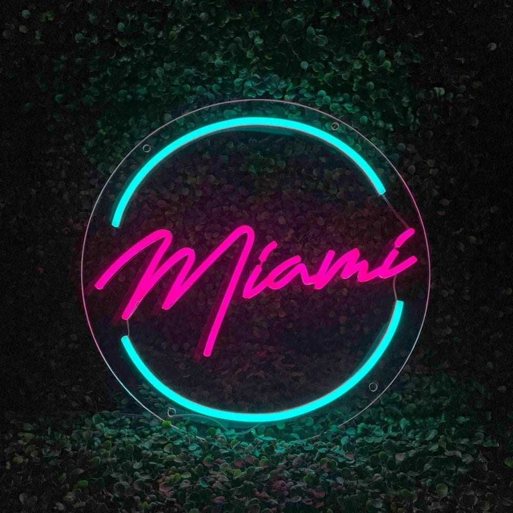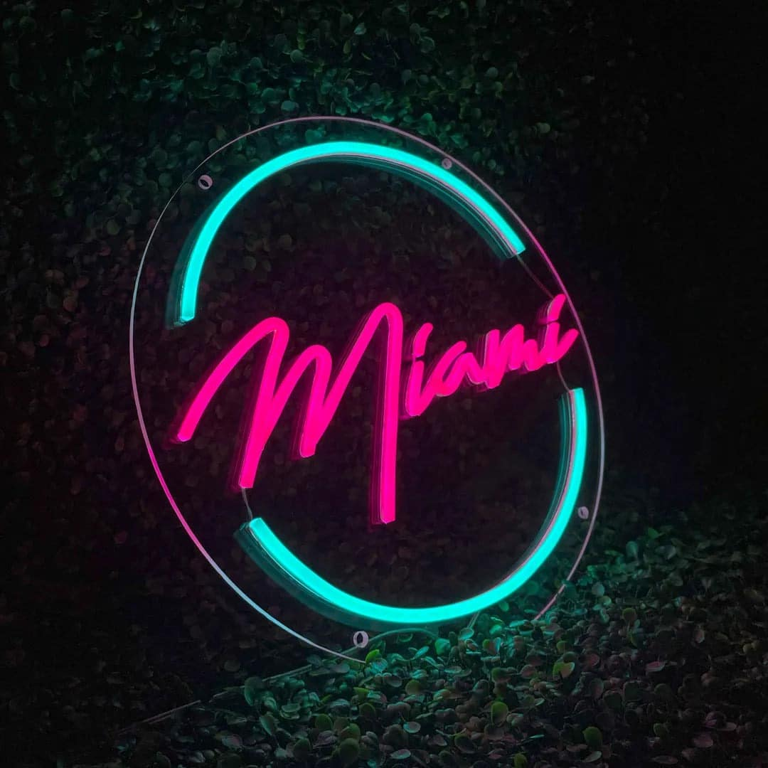 Le Néon Miami présente le mot “Miami” écrit en lettres cursives de couleur rose vif, entouré d’un cercle lumineux bleu turquoise.