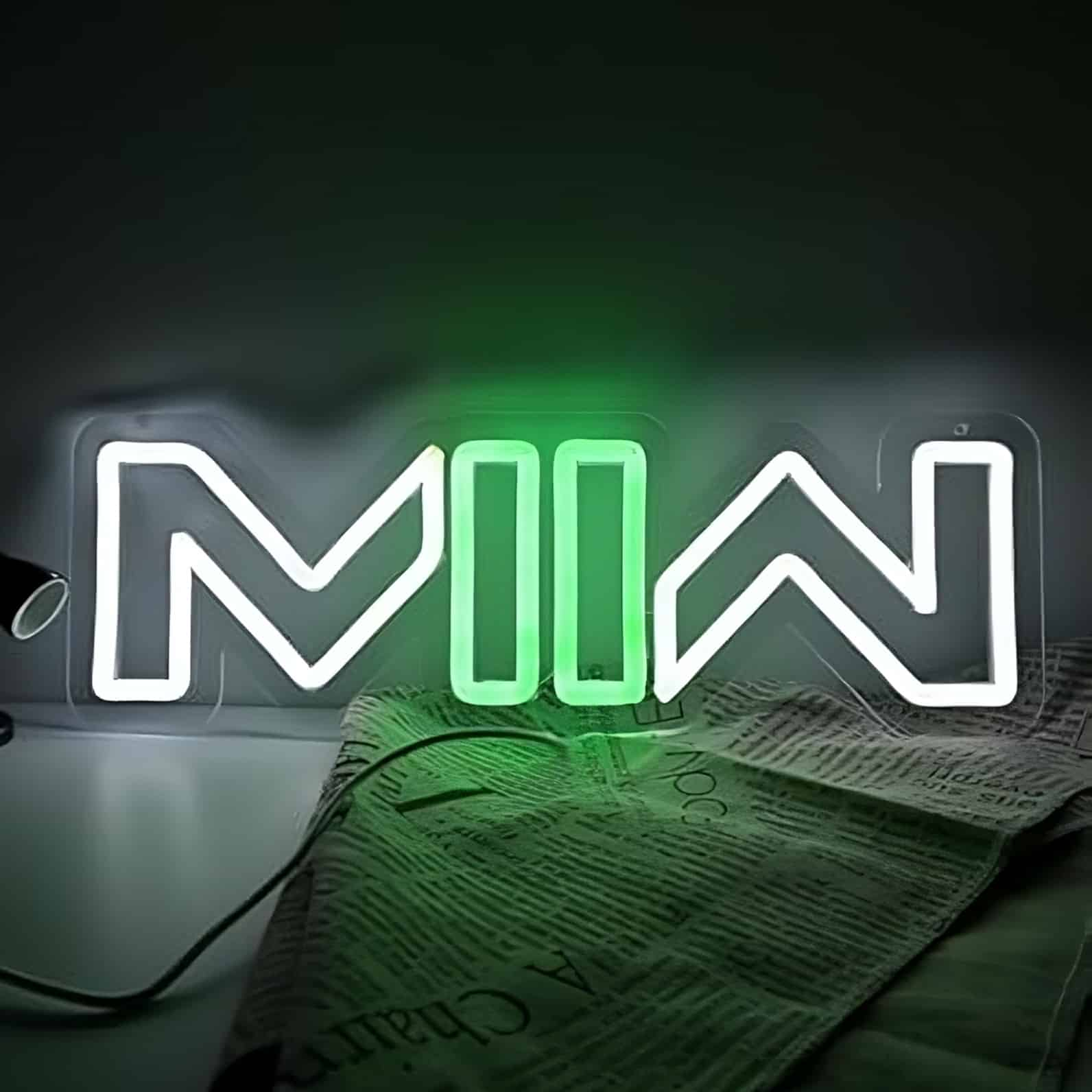 Le Néon Modern Warfare 2 (MWII) représente le logo du jeu vidéo avec les lettres “MW” stylisées en néon blanc brillant, tandis que le chiffre romain “II” est illuminé en vert vif.