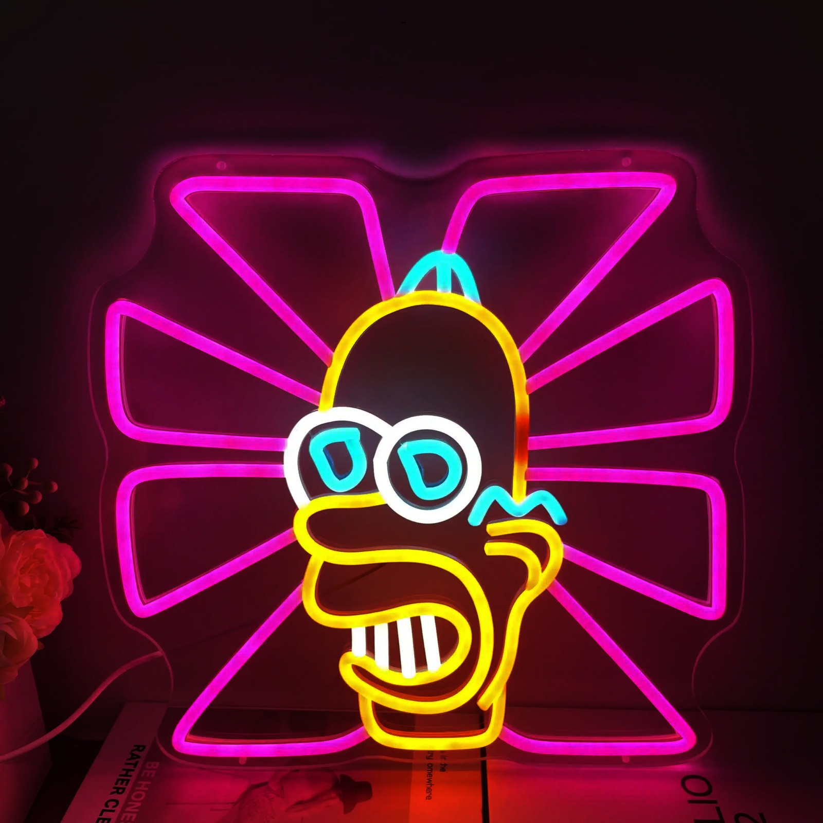 Plongez dans l’univers absurde des Simpson avec ce néon Monsieur Scintillant. La tête jaune d’Homer rayonne au centre d’une fleur psychédélique rose fuchsia, incarnant parfaitement l’esthétique kitsch japonaise.