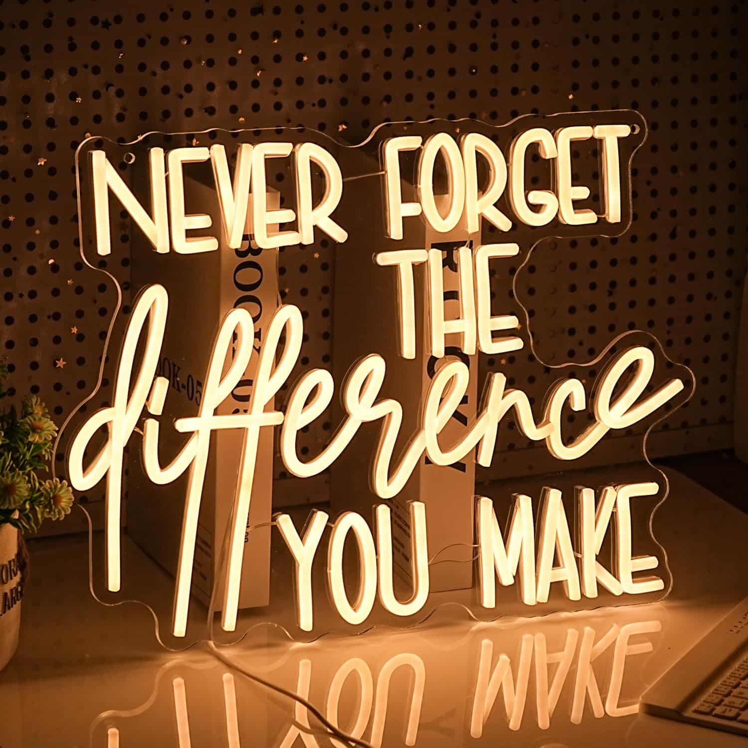 Le Néon Never Forget The Difference You Make affiche un message inspirant en lettres lumineuses dorées.