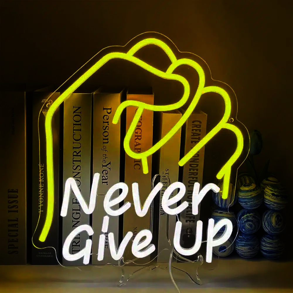 Le Néon Never Give Up affiche un message motivant en lettres blanches, encadré par un dessin de main stylisée en jaune vif.