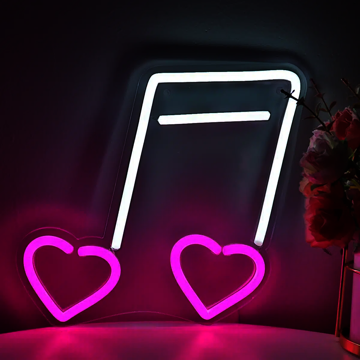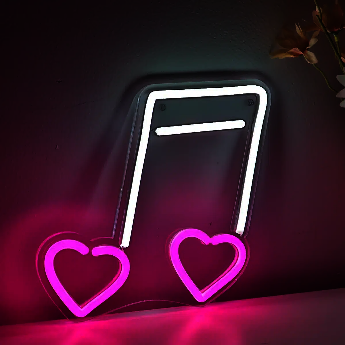Une note de musique blanche illuminée en néon blanc, ornée de deux cœurs roses éclatants. Cette création unique allie harmonieusement passion musicale et romantisme pour tous les amoureux de mélodies.