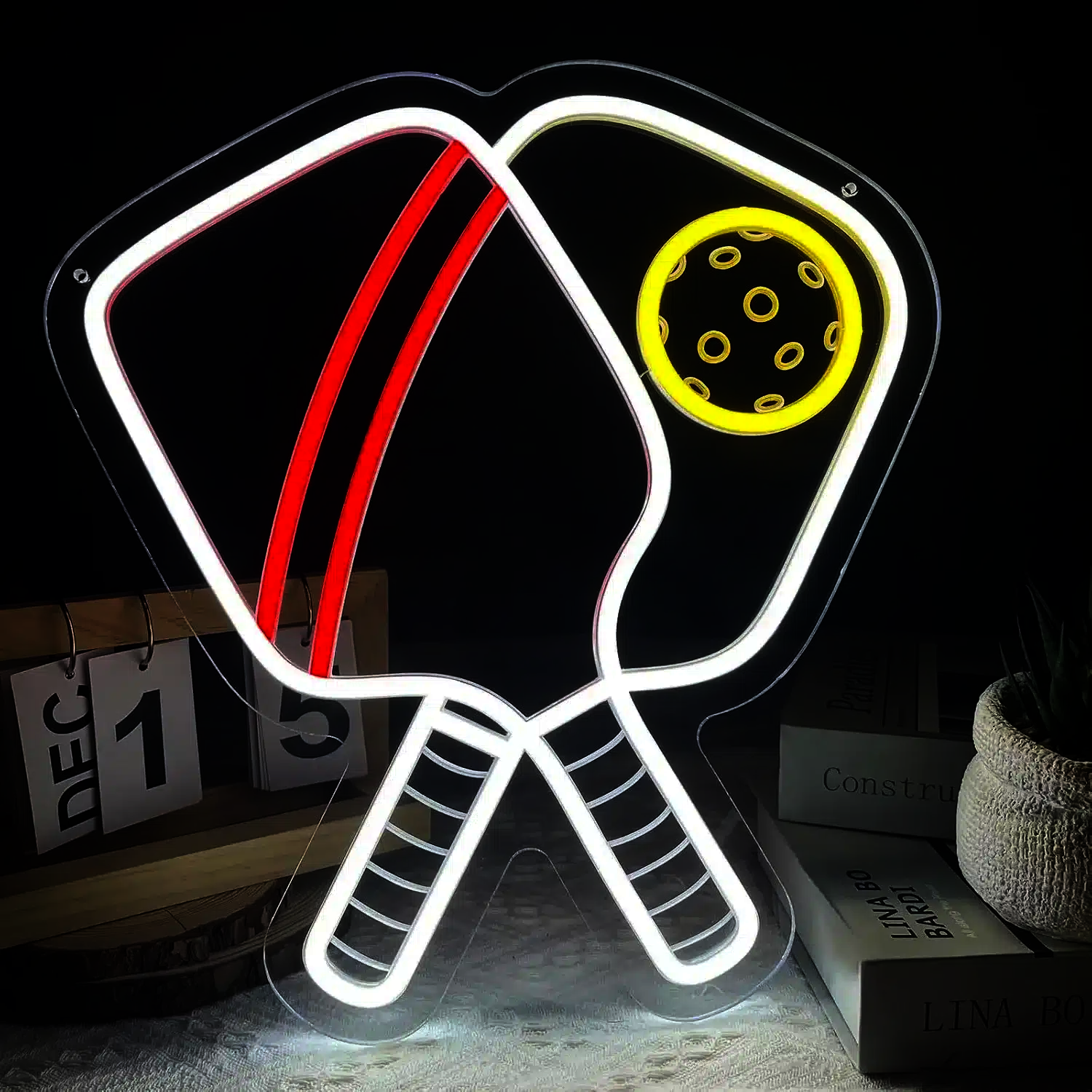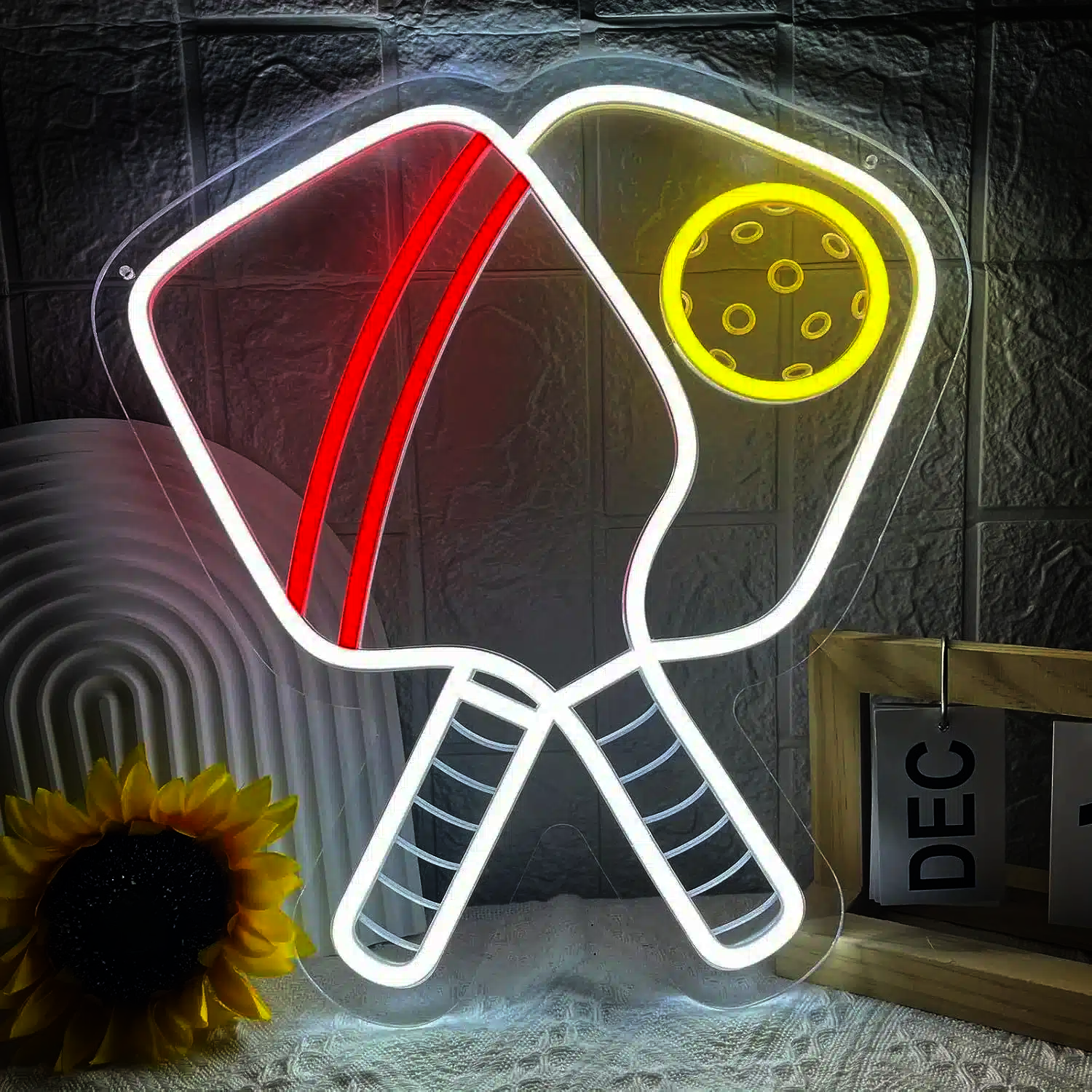 Le Néon Pickleball représente deux raquettes de pickleball croisées accompagnées d’une balle jaune percée de trous caractéristiques de ce sport.