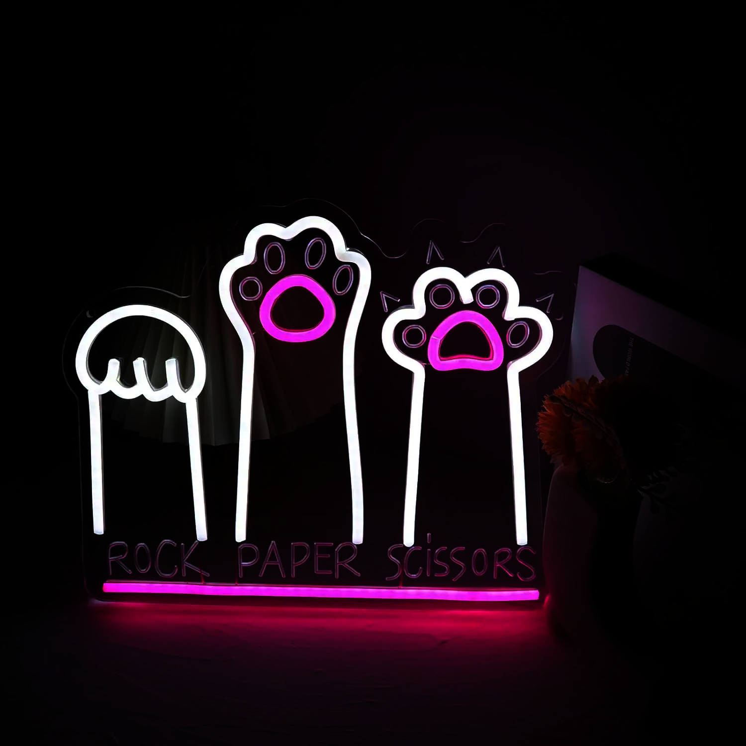 Le Néon Pierre Papier Ciseau Chat représente une version féline du célèbre jeu de société, avec trois pattes de chat stylisées qui remplacent les gestes traditionnels de la main.