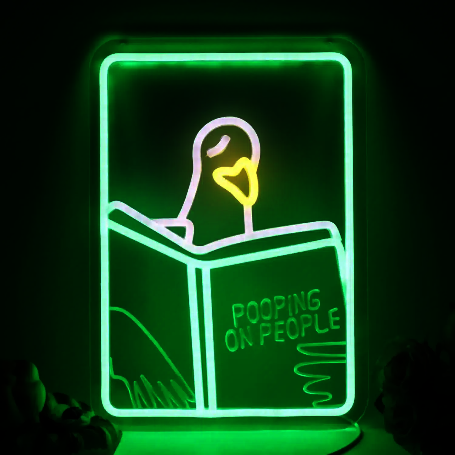 Le Néon Pigeon “Pooping on People” représente un pigeon stylisé en train de lire un livre ouvert portant le titre “Pooping on People” (faire caca sur les gens), comme s’il suivait un manuel pour apprendre à viser les passants dans la rue.