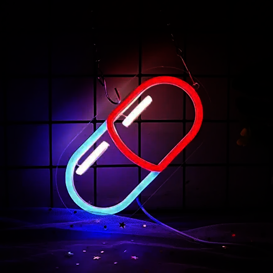 Le Néon Pilule représente une gélule médicale stylisée, combinant les couleurs rouge et bleu.