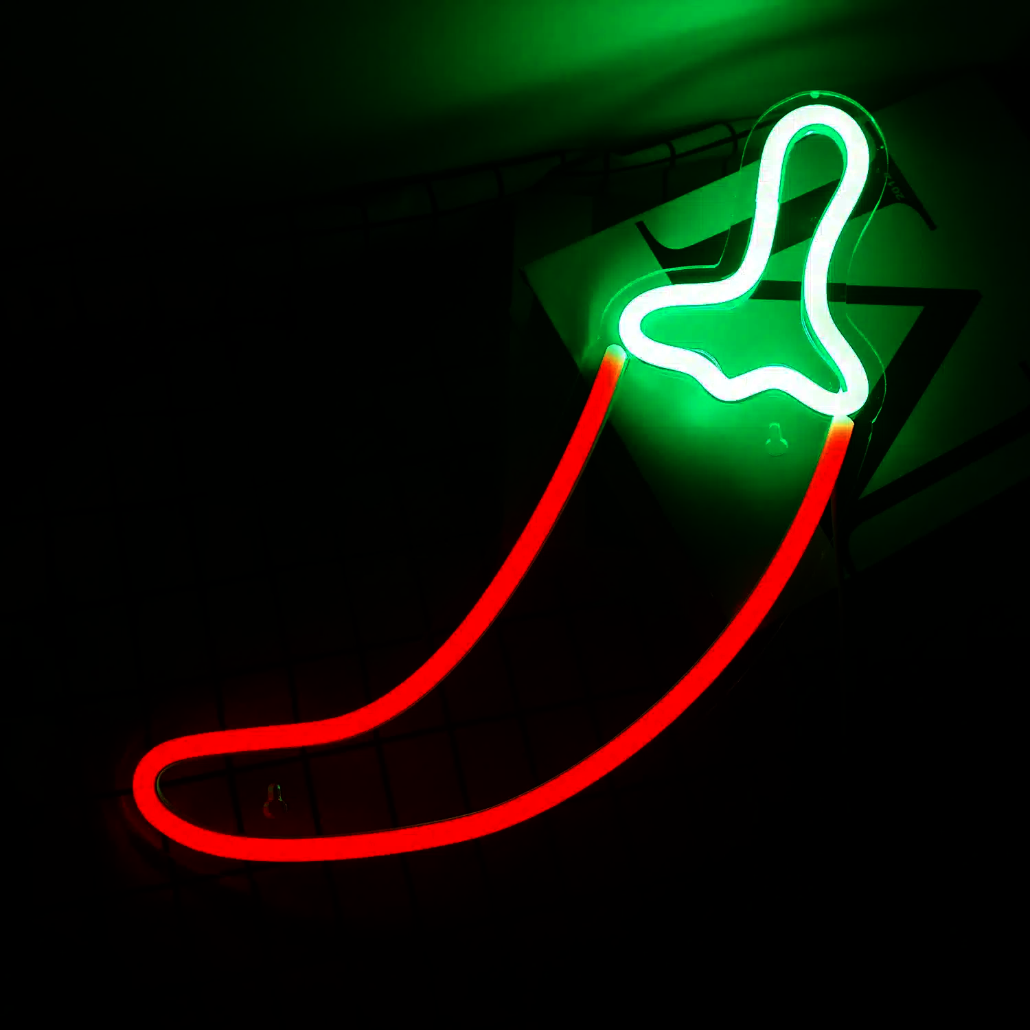 Ce néon unique capture le caractère vif d’un piment, avec une tige verte éclatante qui ajoute un contraste saisissant.