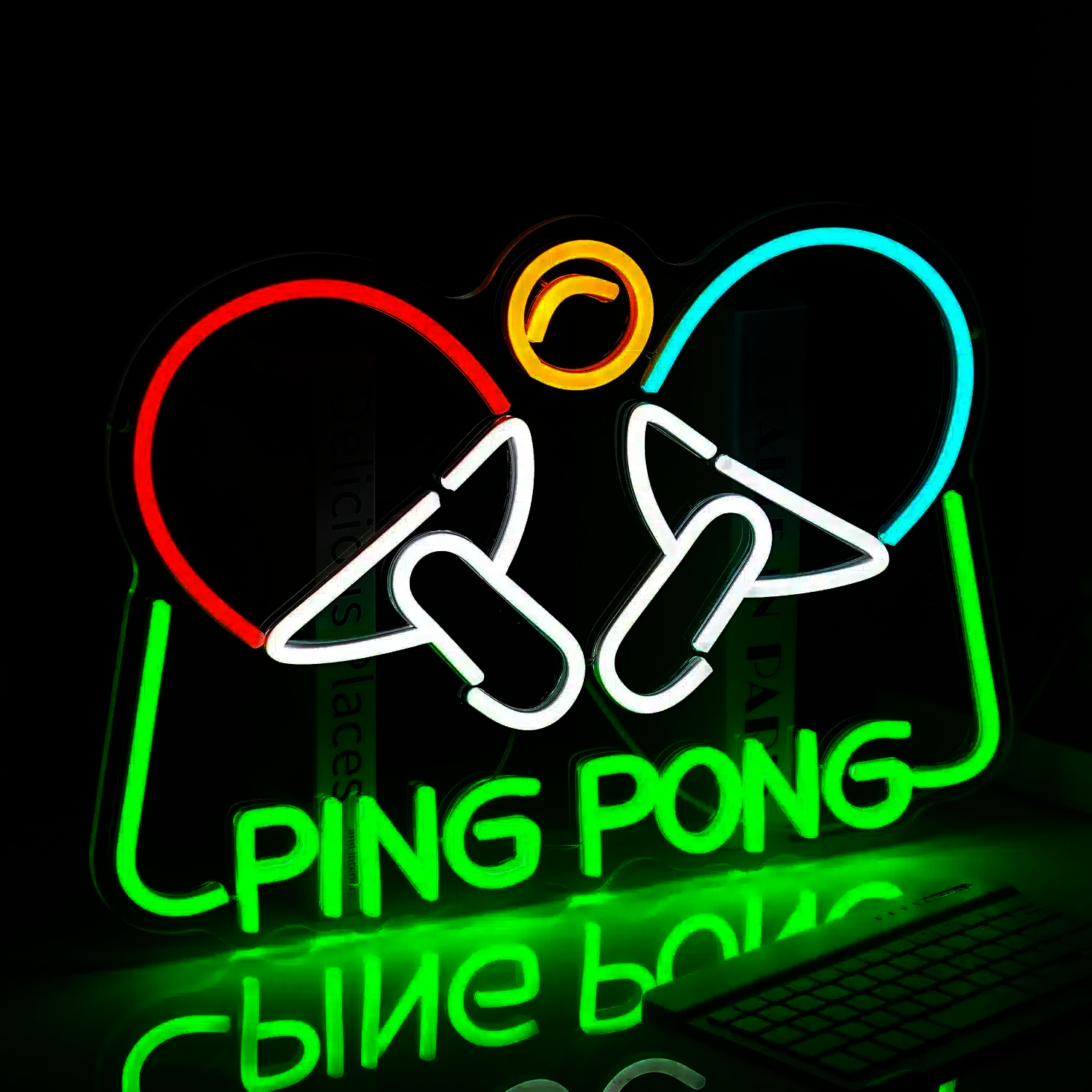 Le Néon Ping Pong représente une scène de tennis de table avec deux raquettes colorées et une balle en mouvement, le tout surmonté de l’inscription “PING PONG” en vert vif.