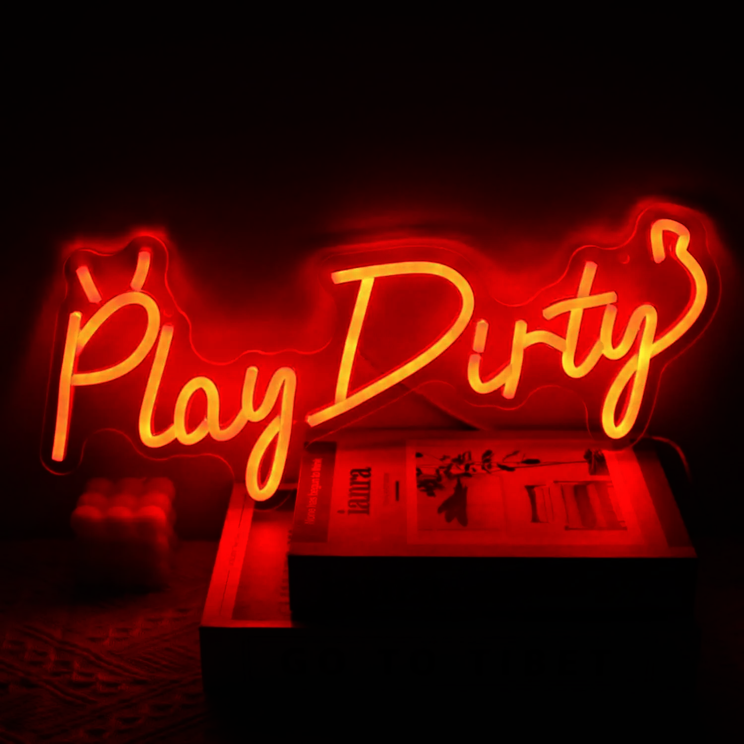 Le Néon Play Dirty affiche en lettres cursives lumineuses le message provocateur “Play Dirty”.