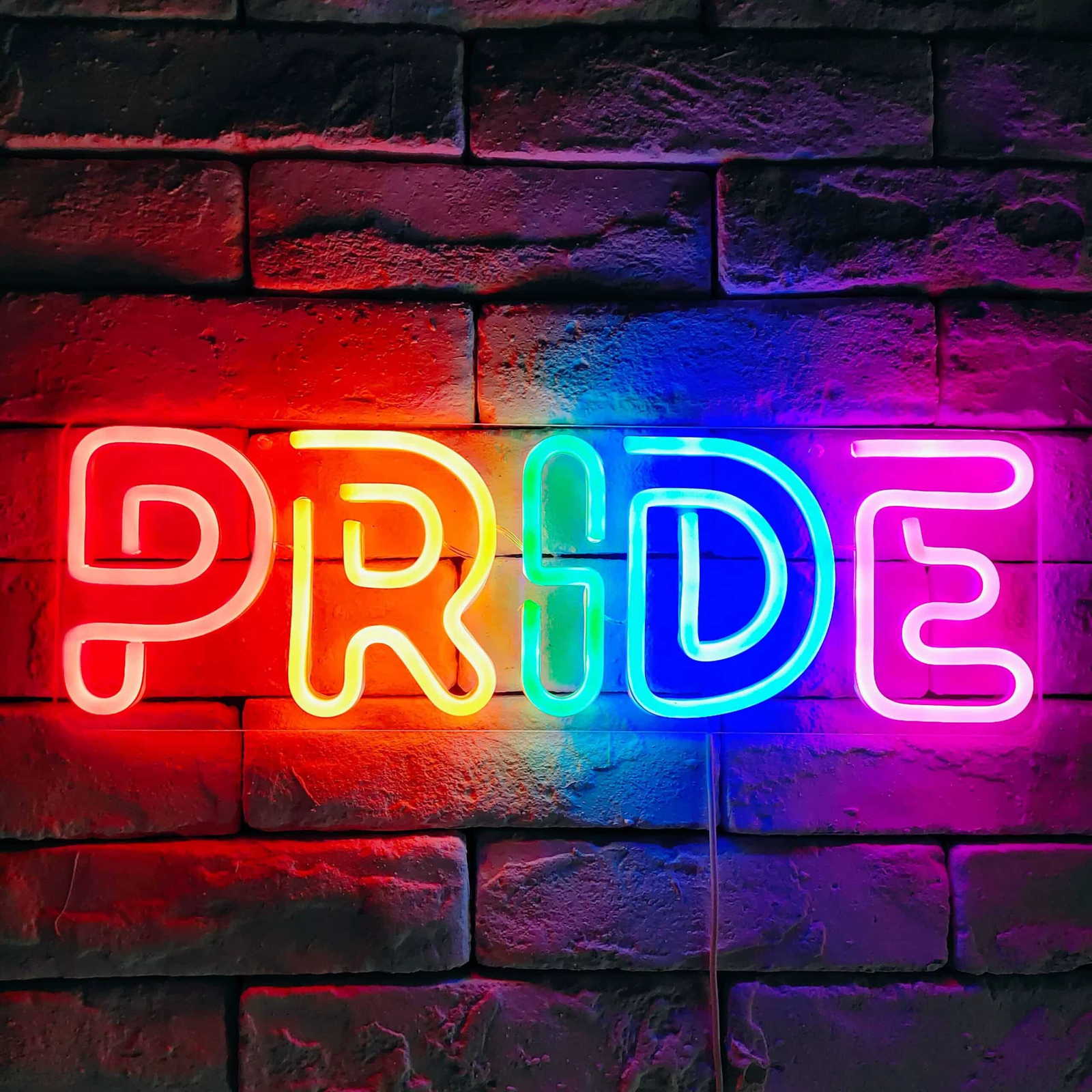 Le Néon Pride affiche le mot “PRIDE” en lettres majuscules avec un dégradé de couleurs arc-en-ciel caractéristique du mouvement LGBTQ+.