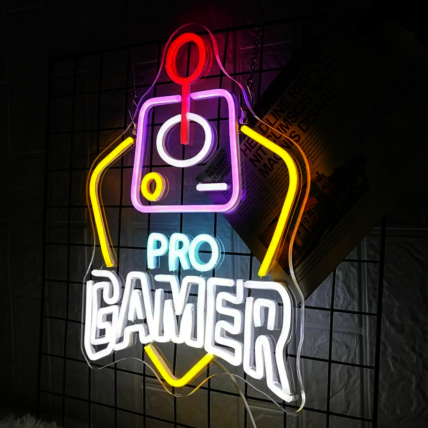 Ce néon affiche clairement les mots “PRO GAMER” en lettres lumineuses bleues-blanches en bas du design, parfaitement lisibles et mettant en avant l’identité gaming du produit.