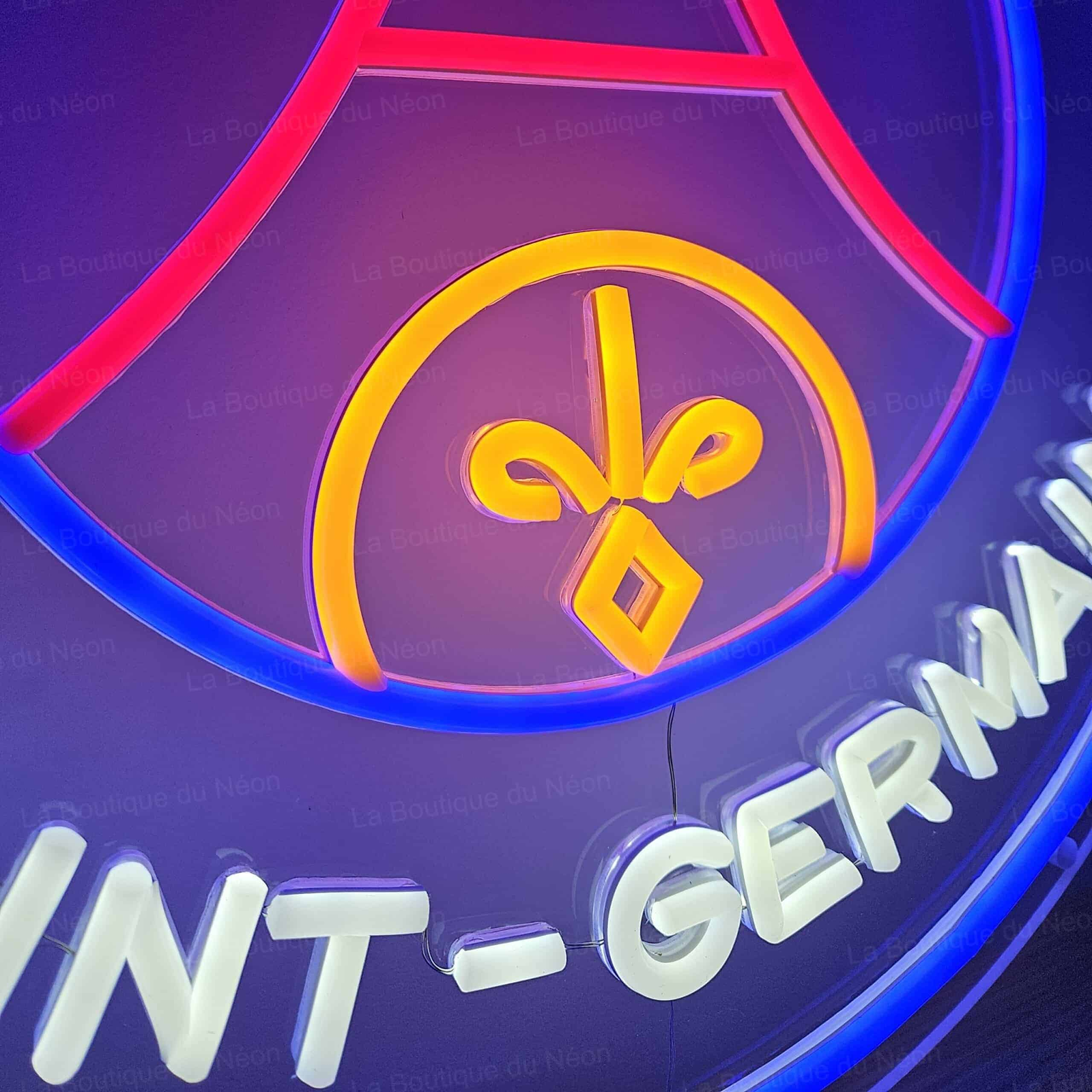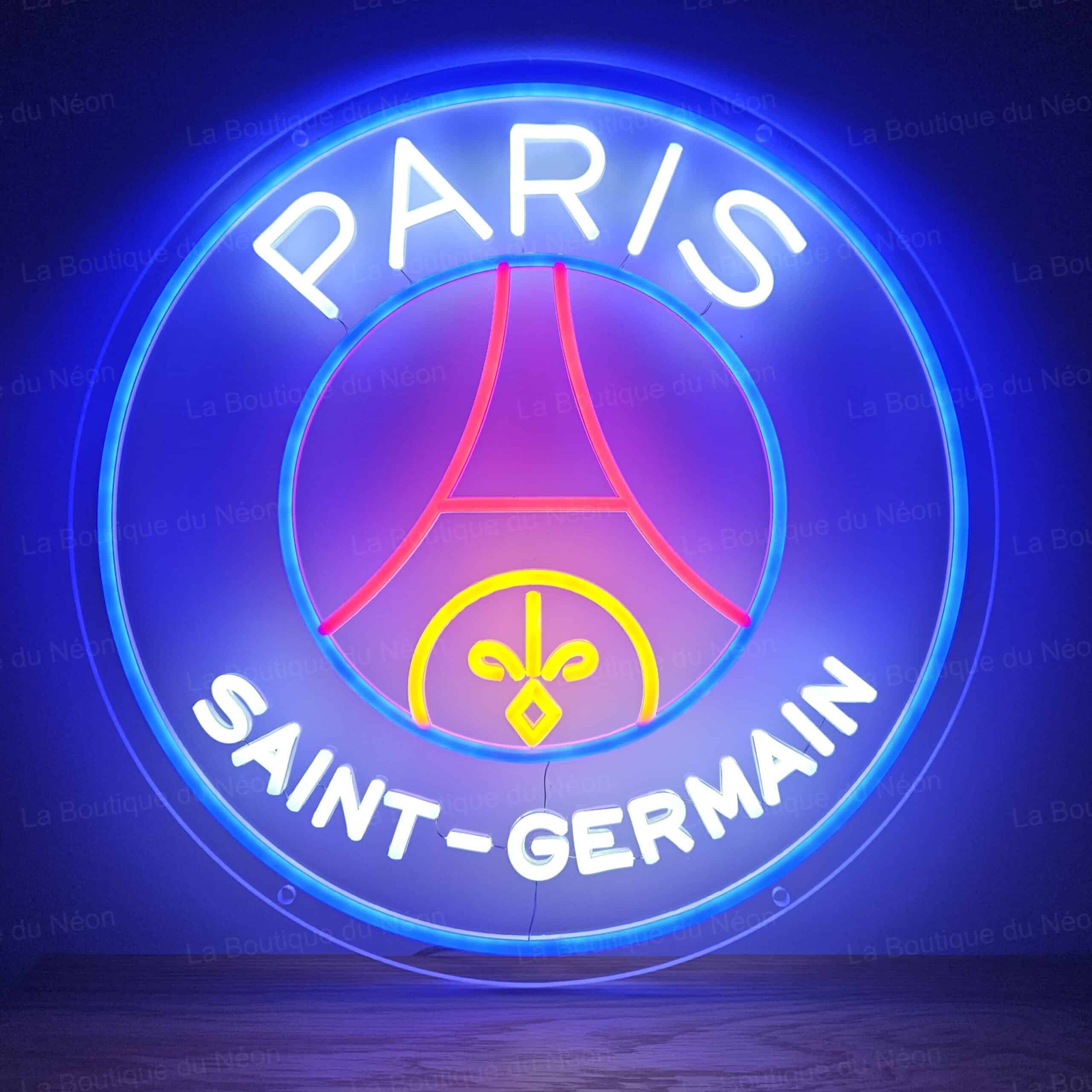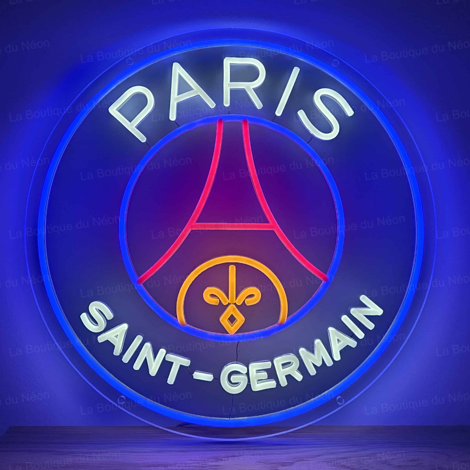 Le Néon PSG représente le logo officiel du Paris Saint-Germain, avec son emblématique design circulaire illuminé en bleu vif et rouge.
